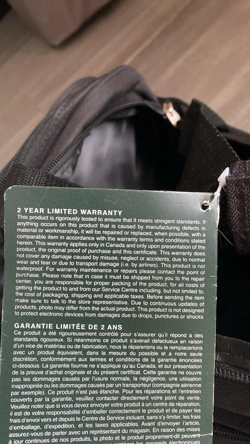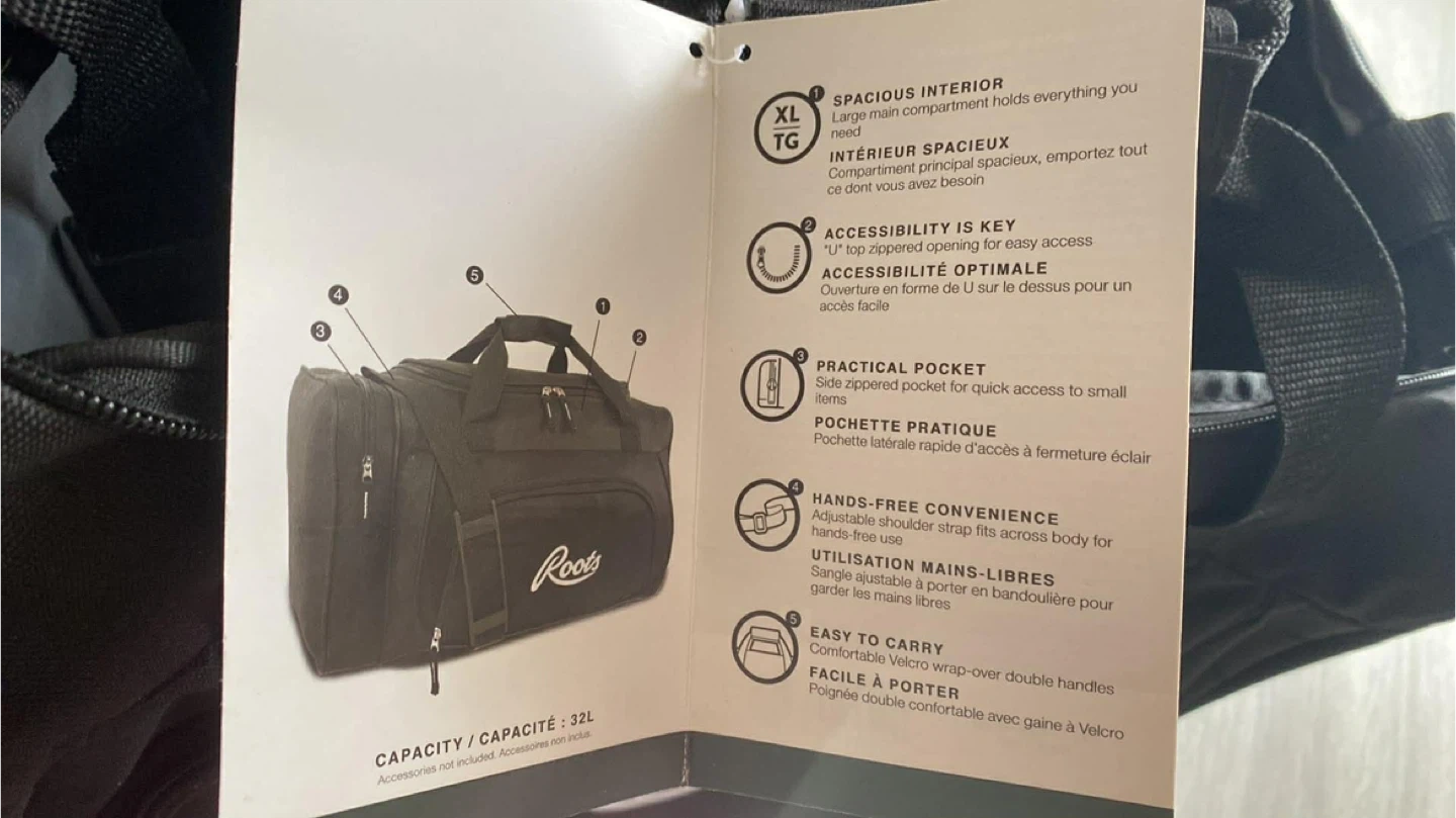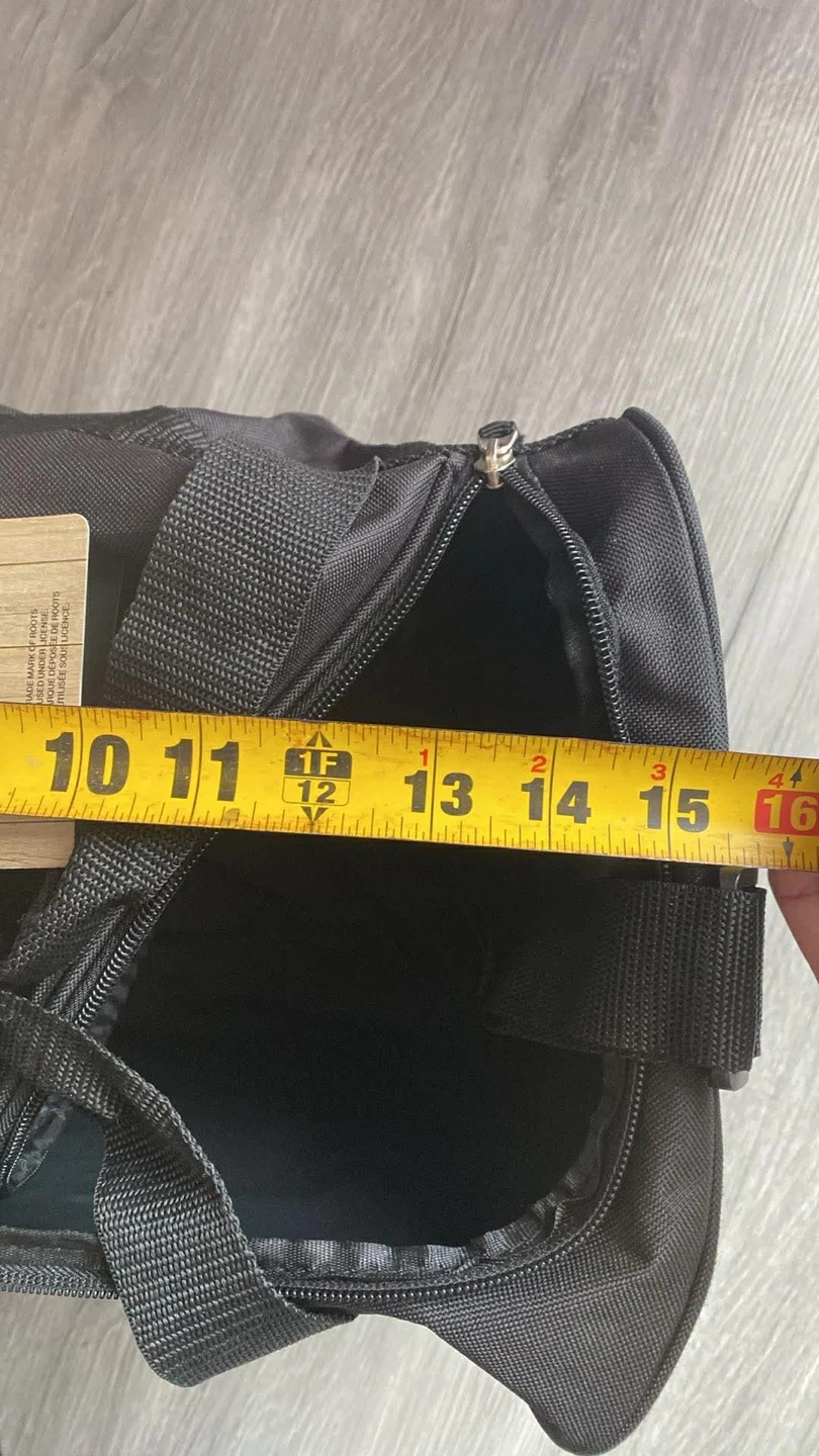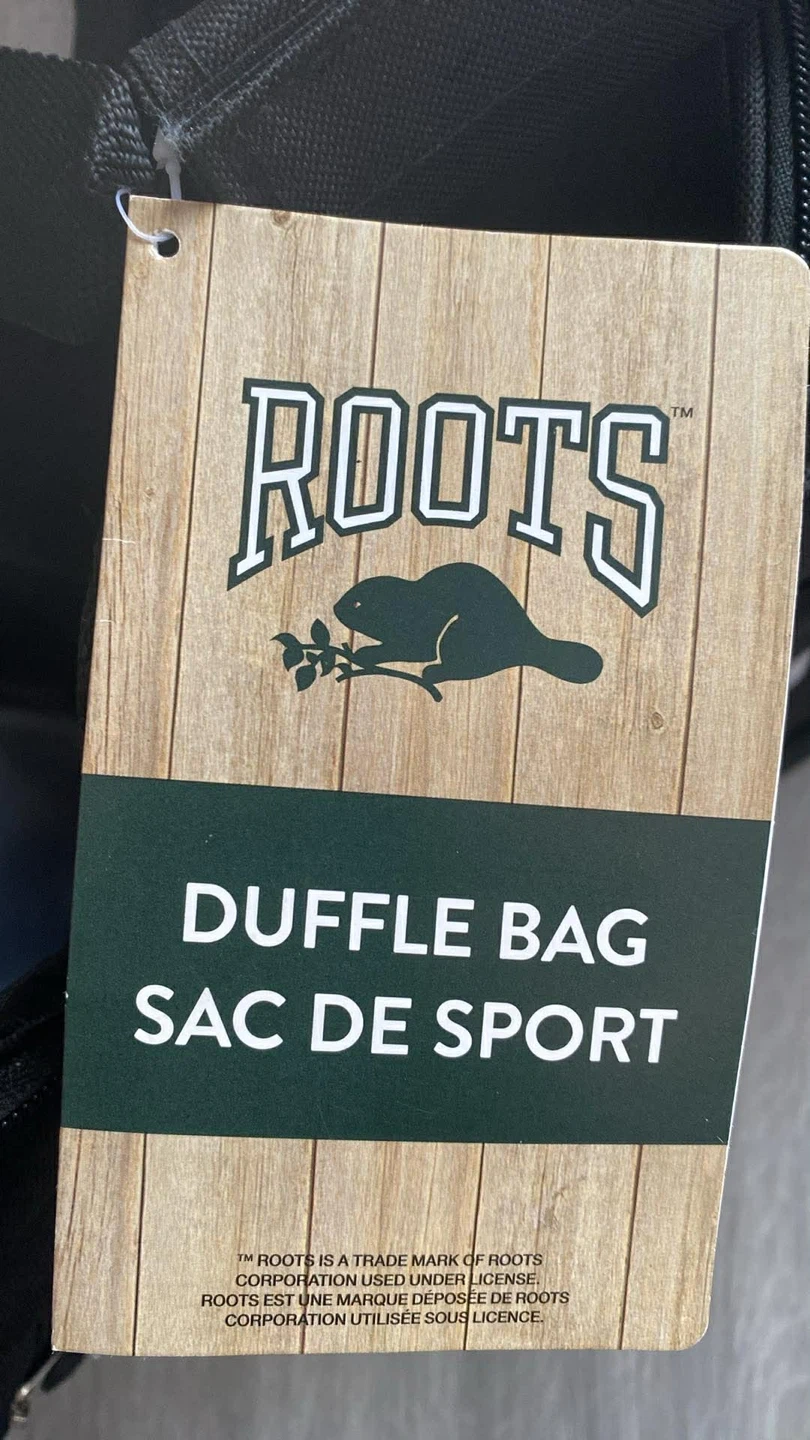 This is a black Roots duffle bag with a 32L capacity. It features a spacious interior and a U-shaped zippered opening for easy access. It also has a practical side pocket for small items and comfortable handles with Velcro wrap.