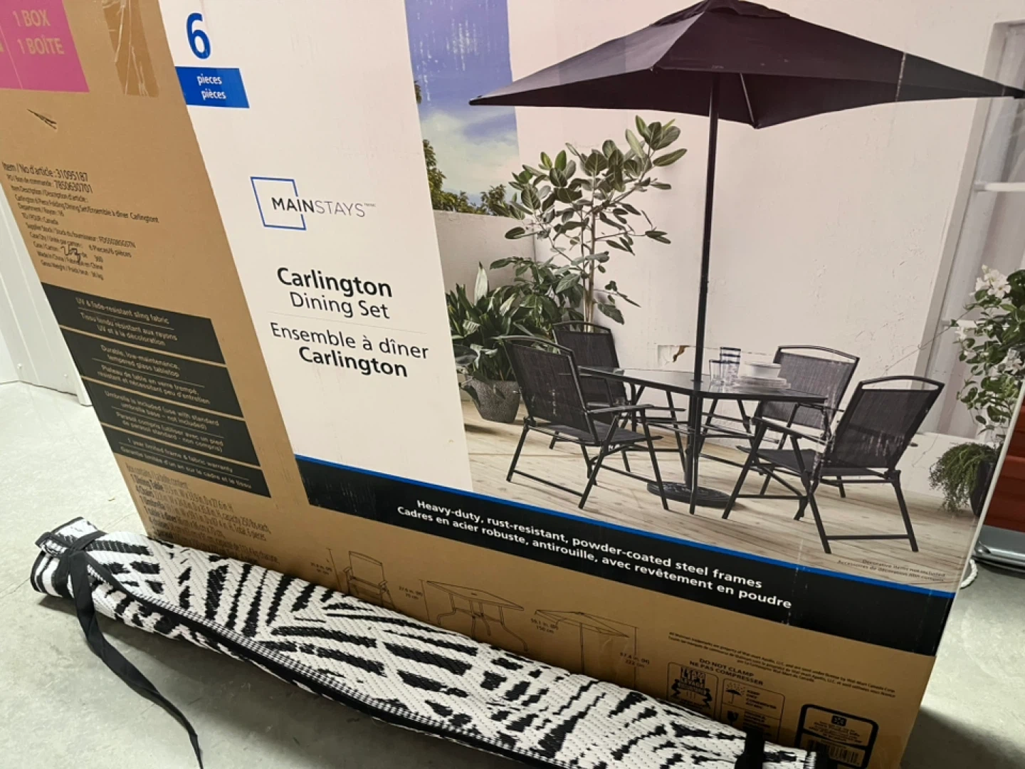 This Mainstays Carlington Dining Set includes a table and two chairs. The frames are heavy-duty, rust-resistant, and powder-coated steel. This set is perfect for enjoying meals or relaxing outdoors.