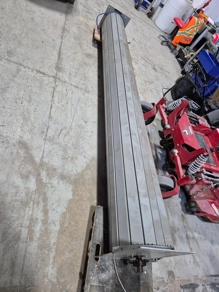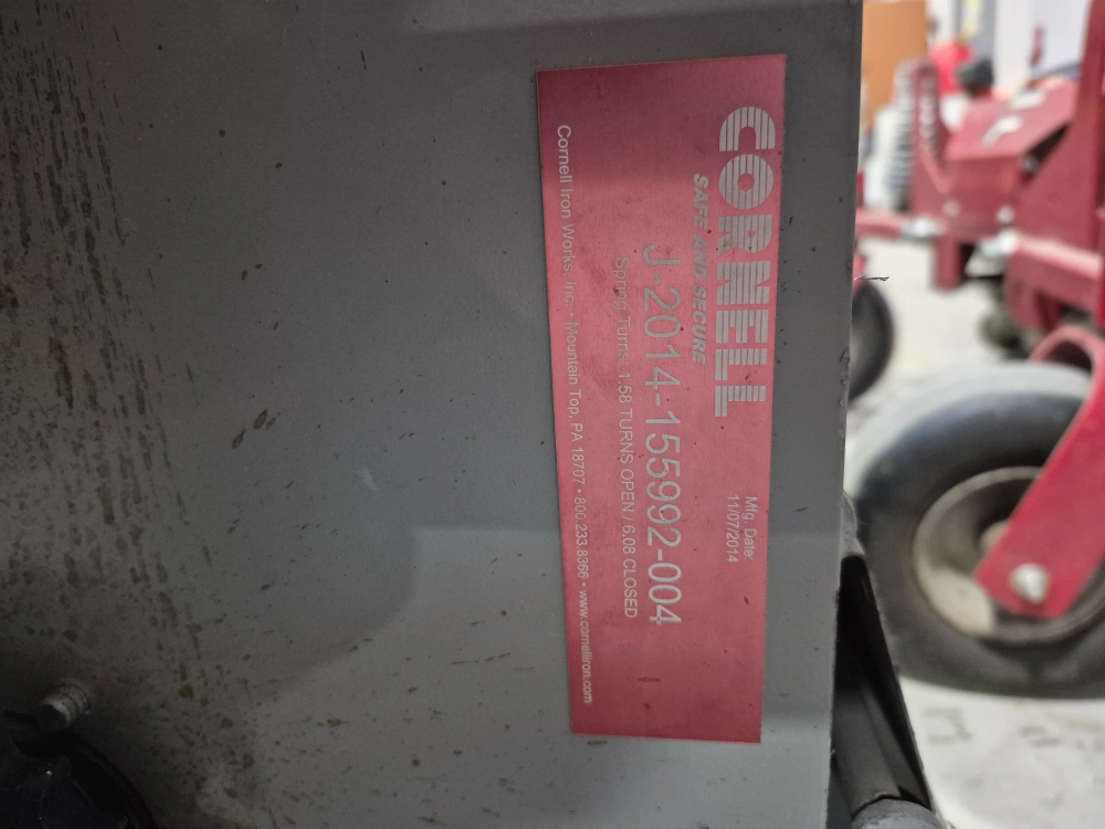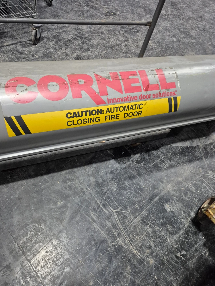 This is a Cornell automatic closing fire door. It's designed for safety and security. The door has a metal construction and comes with a retraction mechanism.