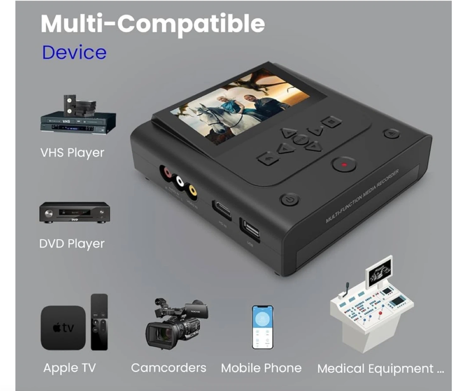 This is a multi-function media recorder. It's compatible with VHS players, DVD players, Apple TV, camcorders, mobile phones, and medical equipment. It allows for recording from various sources.