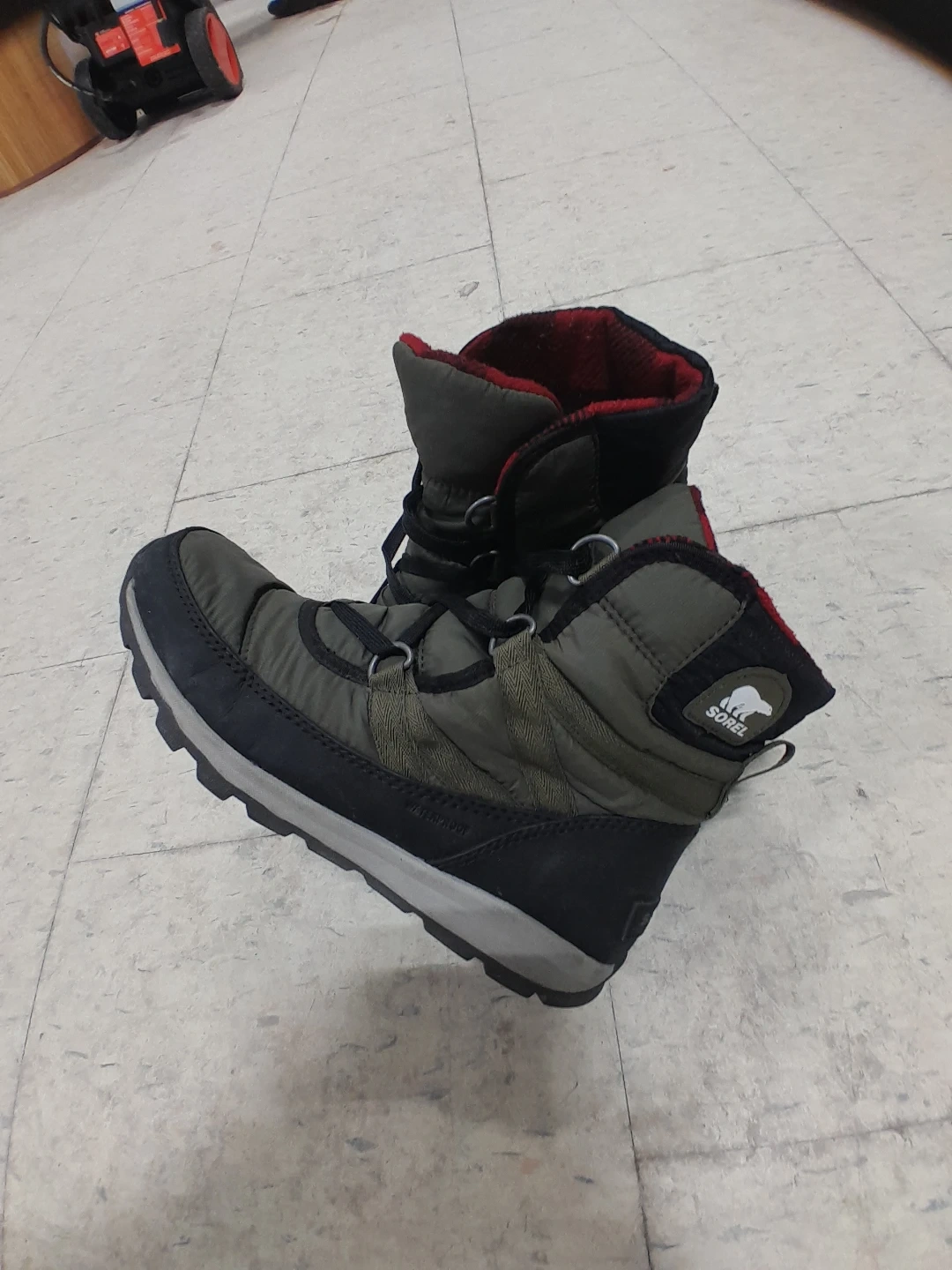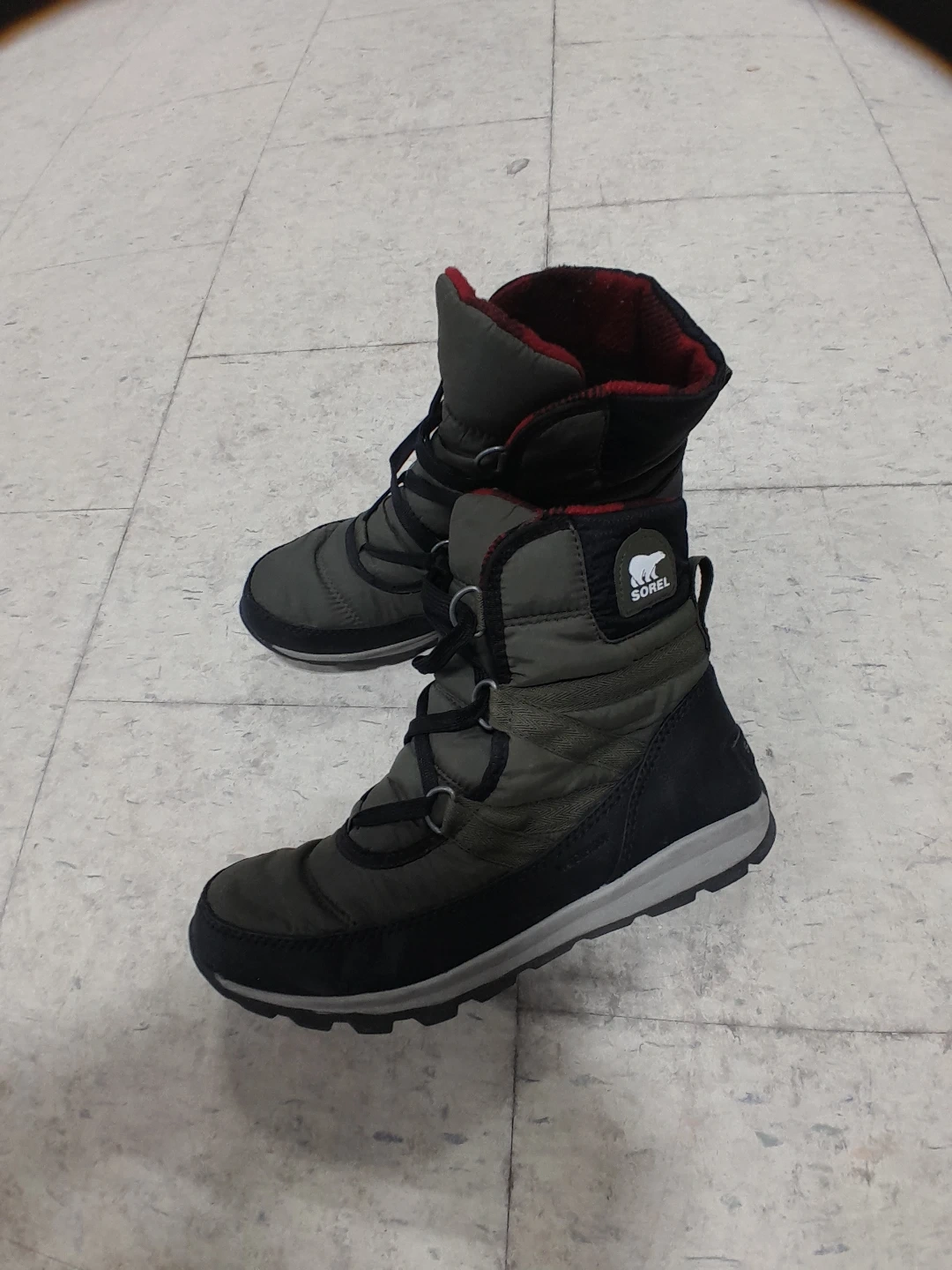 Warm Sorel winter boots in a dark green and black colour. They're insulated for cold weather. Perfect for snowy days! Women's Size 8