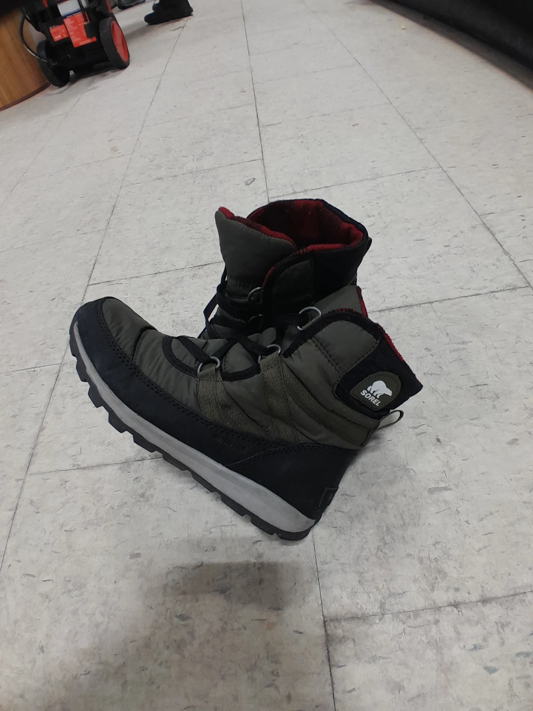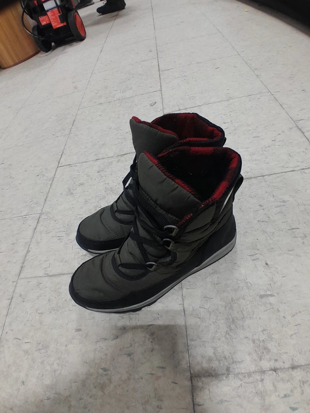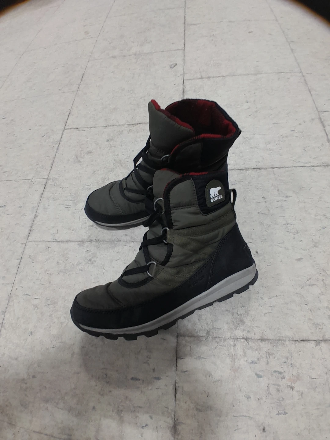 Warm Sorel winter boots in a dark green and black colour. They're insulated for cold weather. Perfect for snowy days! Women's Size 8