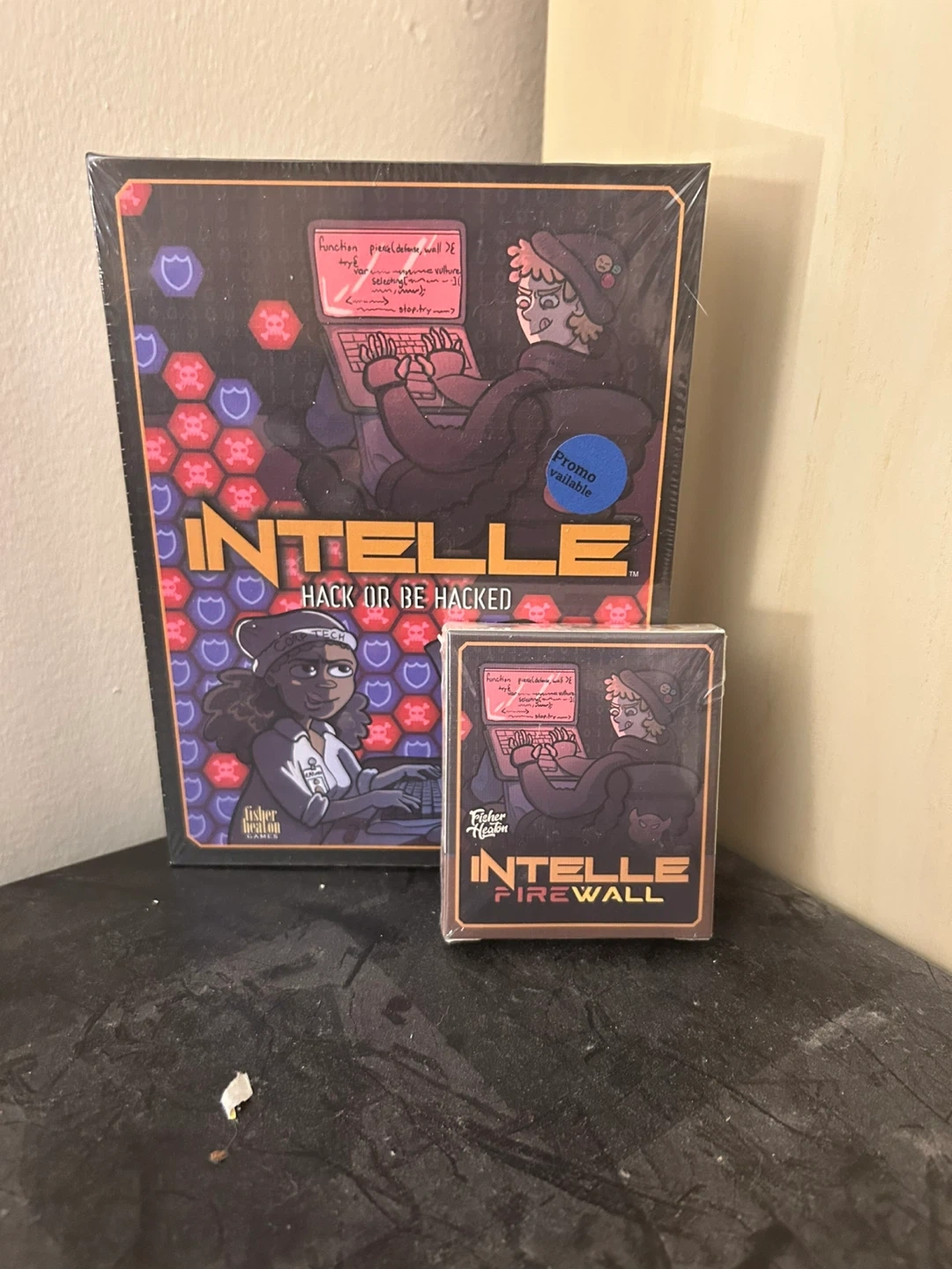 This is the Intelle Hack or Be Hacked board game by Fisher Heaton Games. It includes the base game and the Intelle Firewall expansion. Both are factory sealed.