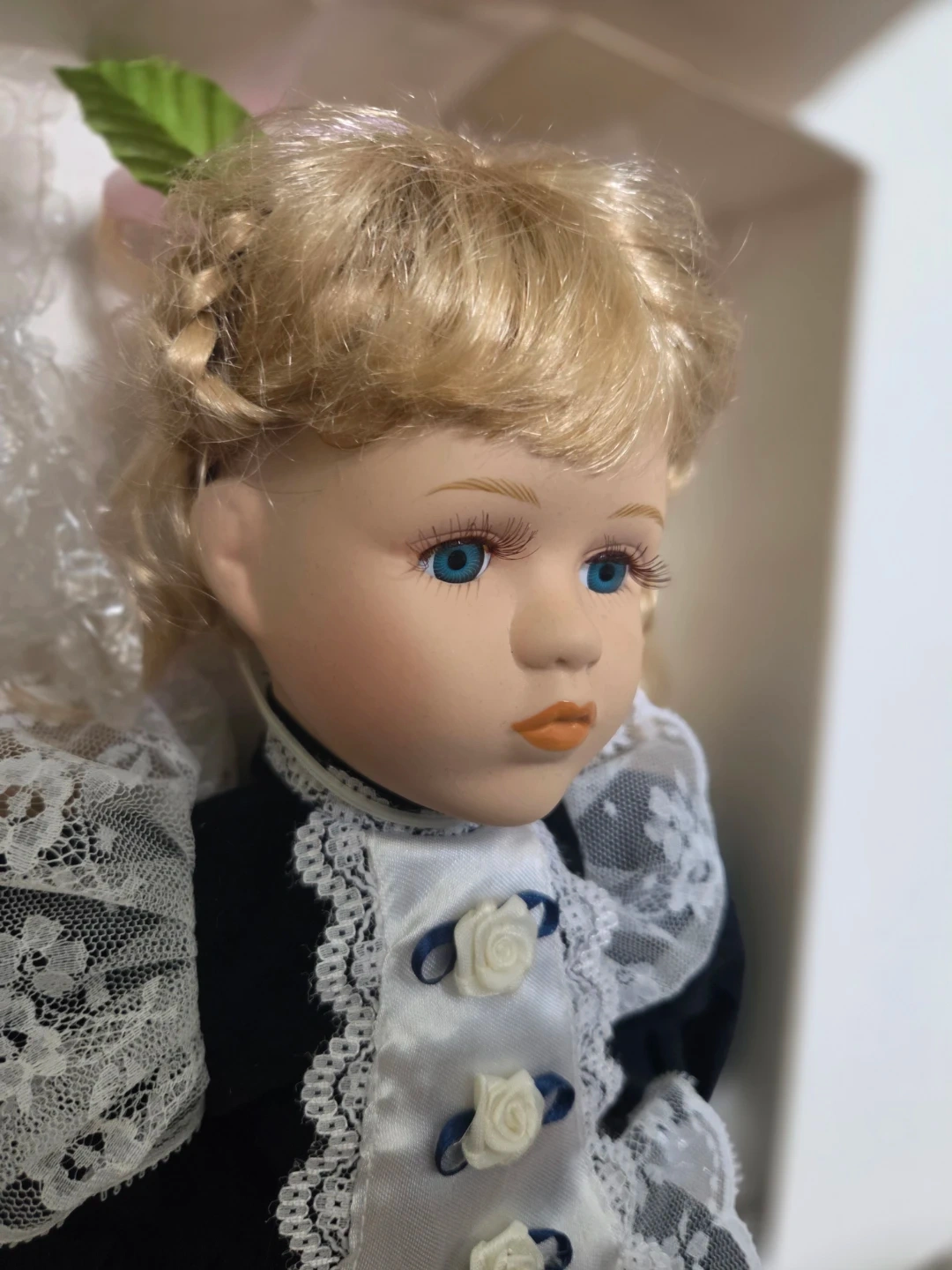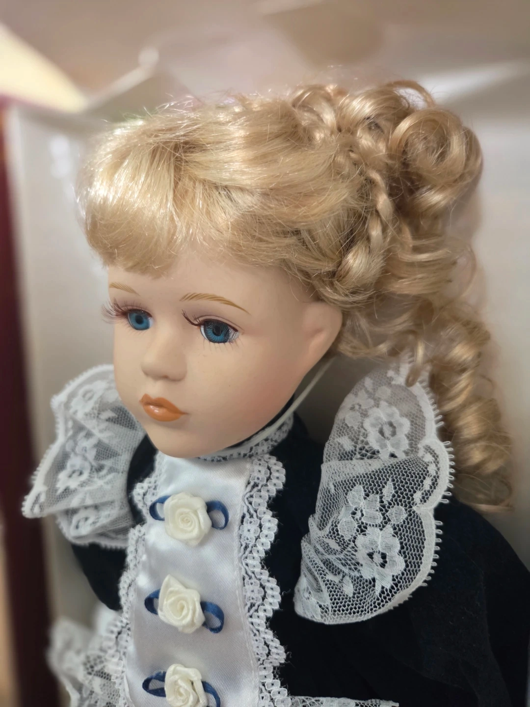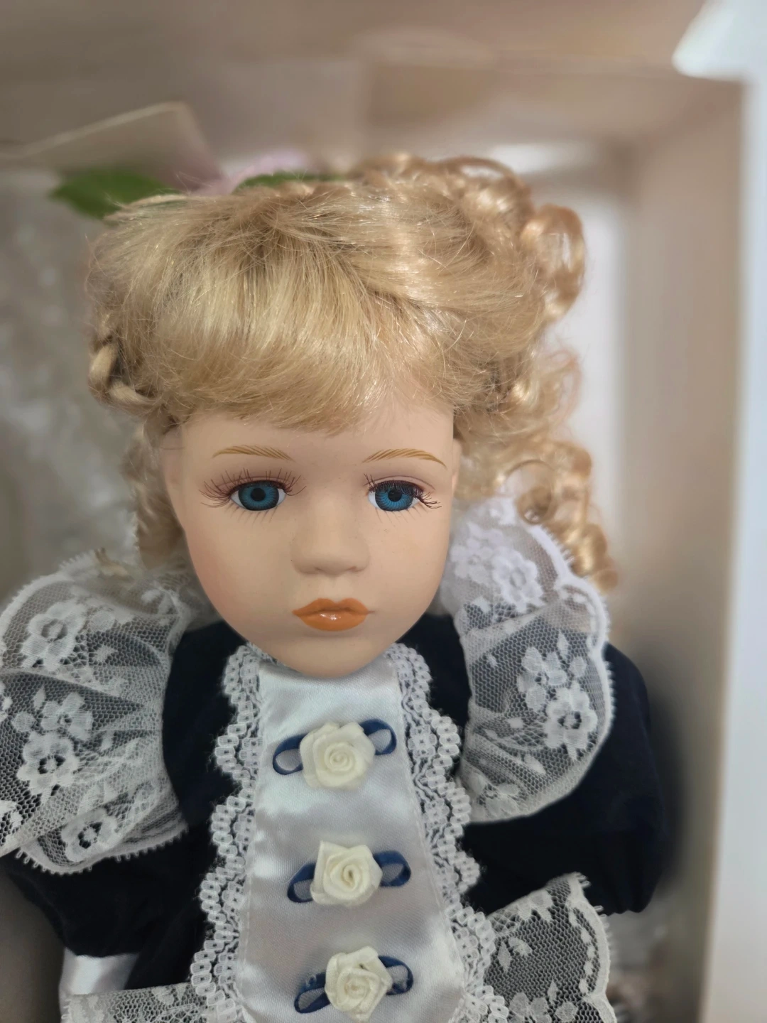 Beautiful Genuine porcelain doll with blue eyes and blonde hair. Original packaging; although there are some tears and scratches across the box(see photos). Both feet are still bubble wrapped and one hand. The outfit features a beautiful blue velvety material with lace. She does come with a display stand and a certificate.