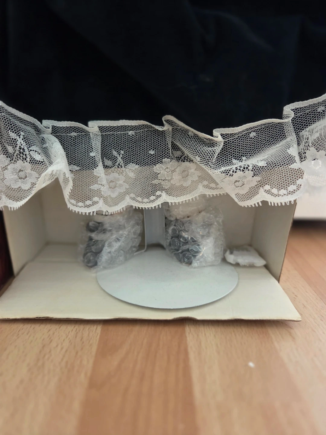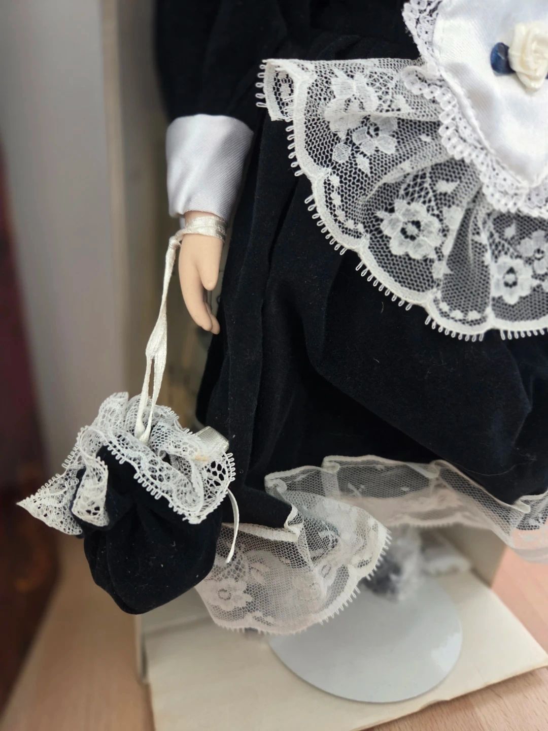 Beautiful Genuine porcelain doll with blue eyes and blonde hair. Original packaging; although there are some tears and scratches across the box(see photos). Both feet are still bubble wrapped and one hand. The outfit features a beautiful blue velvety material with lace. She does come with a display stand and a certificate.