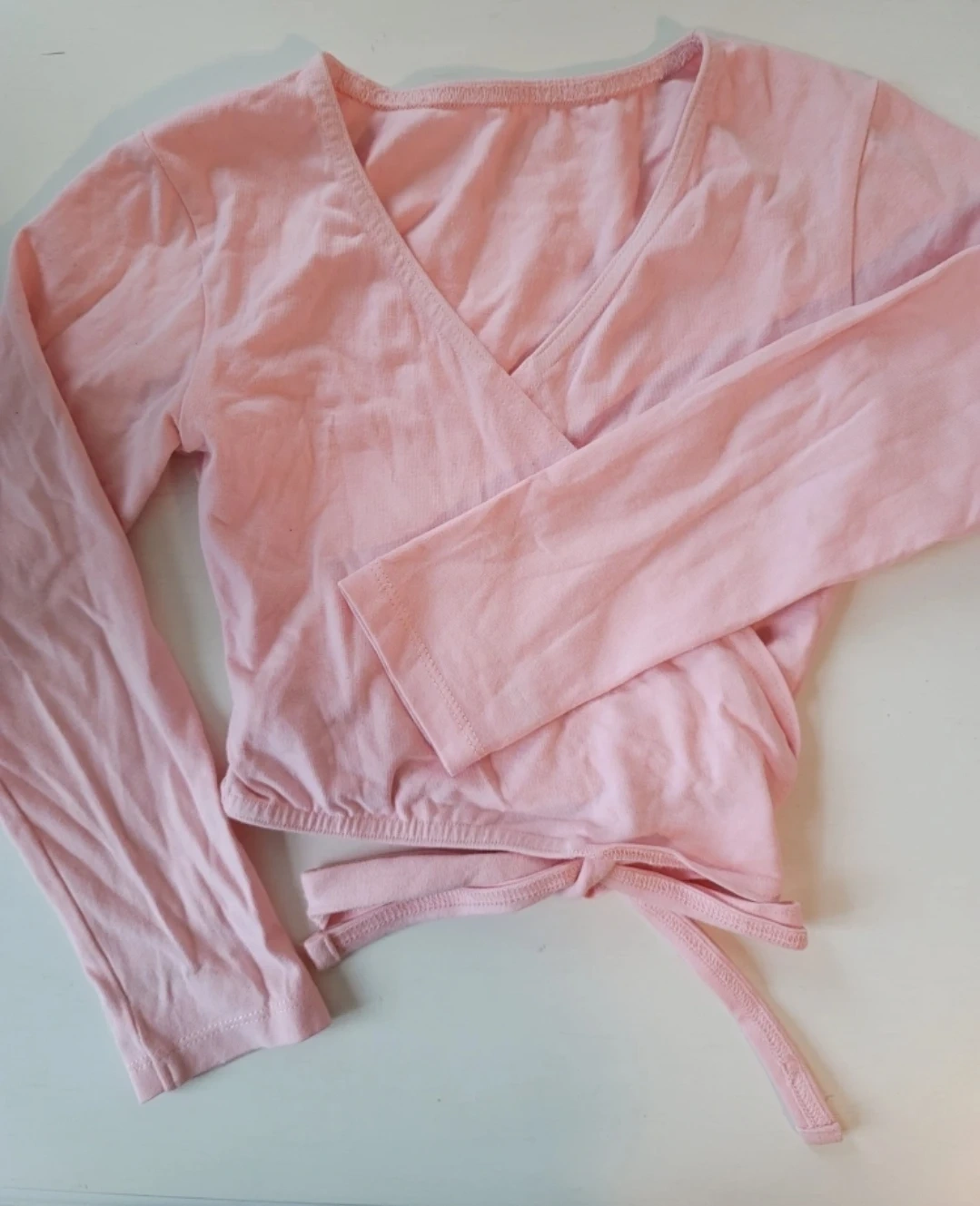 This is a light pink long-sleeve wrap top. It's made of a soft cotton blend. The wrap style allows for an adjustable fit.
