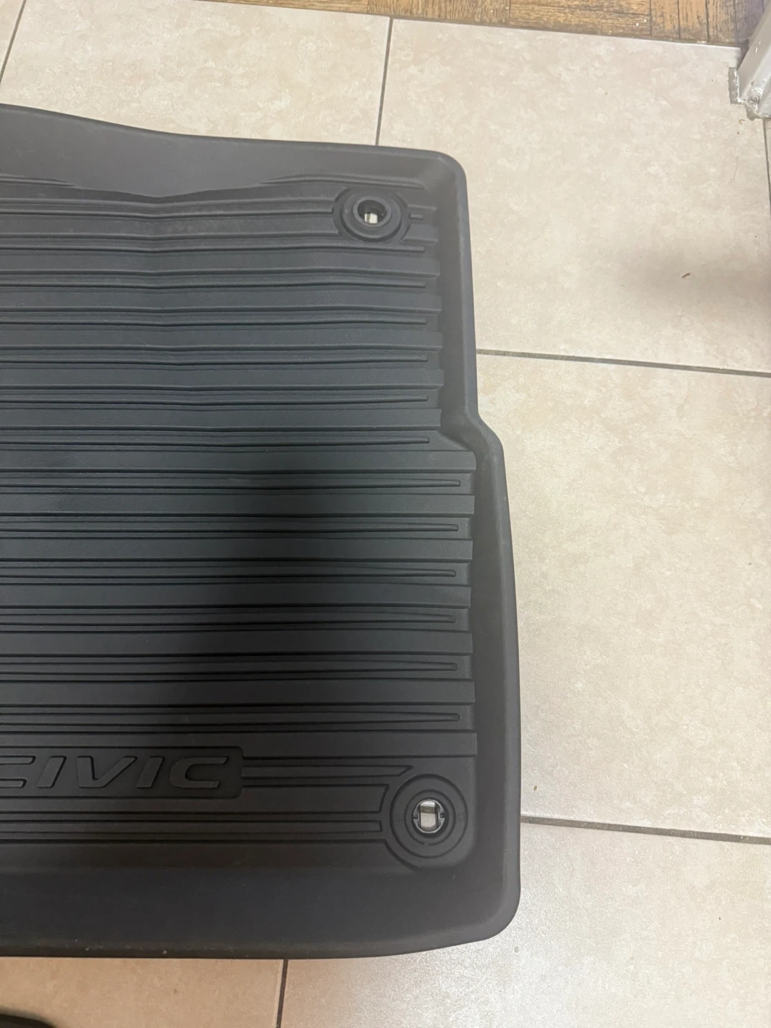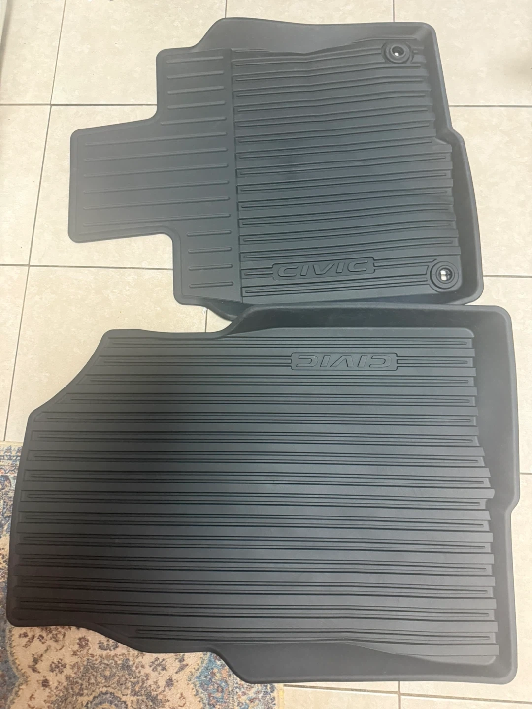 Set of black all-weather floor mats for a Honda Civic. 17 to22 fit These mats feature a ribbed design for trapping dirt and debris. They include retaining clips for secure placement. This set is designed to protect your car's interior from the elements. But my car is at 21.