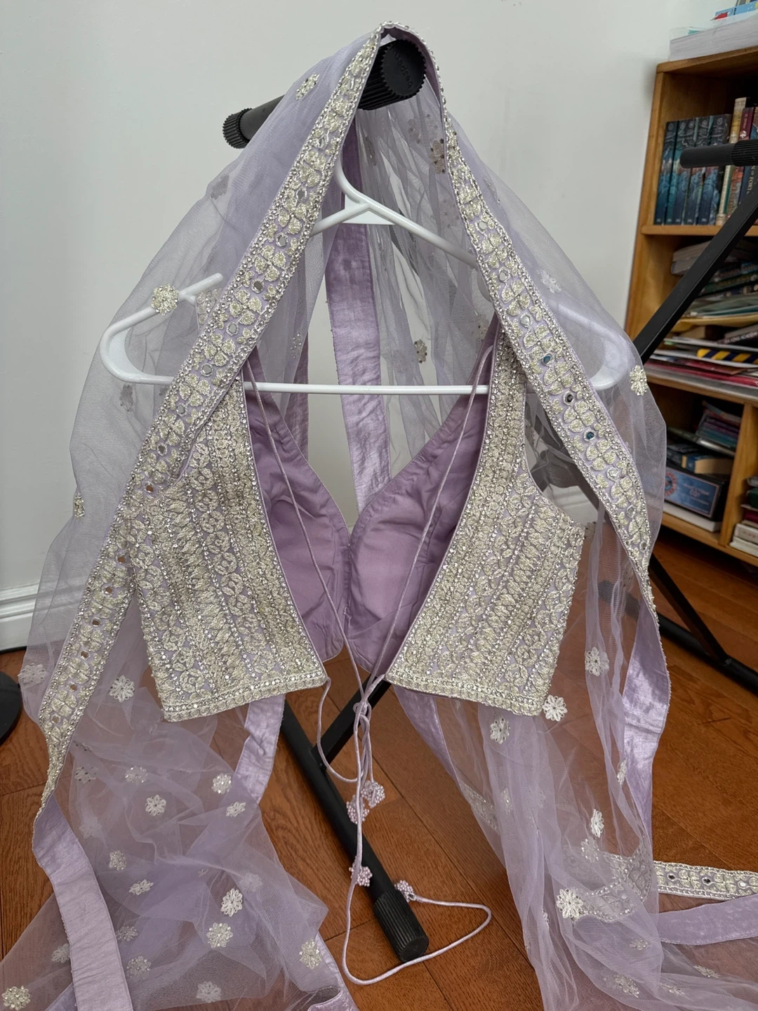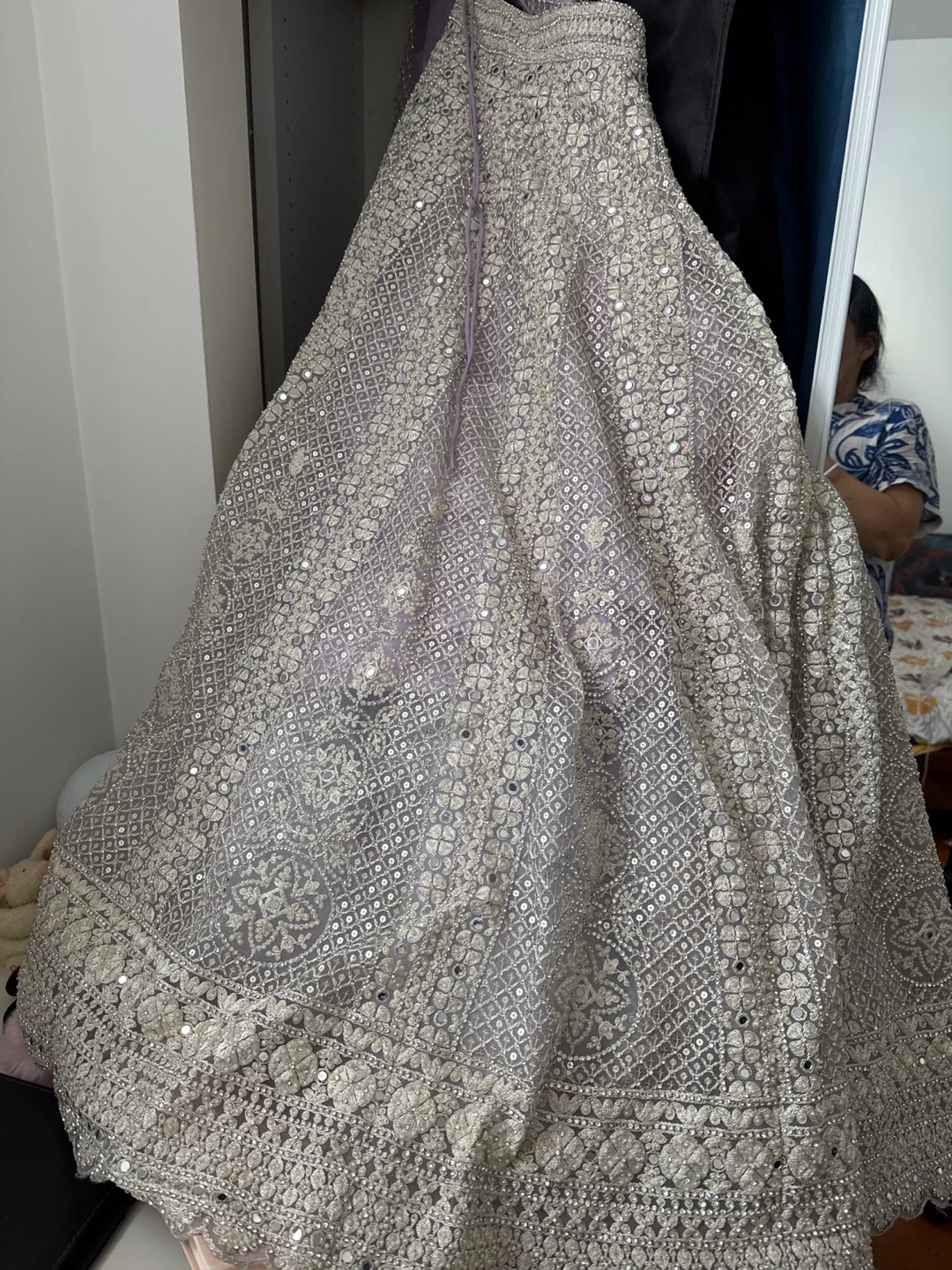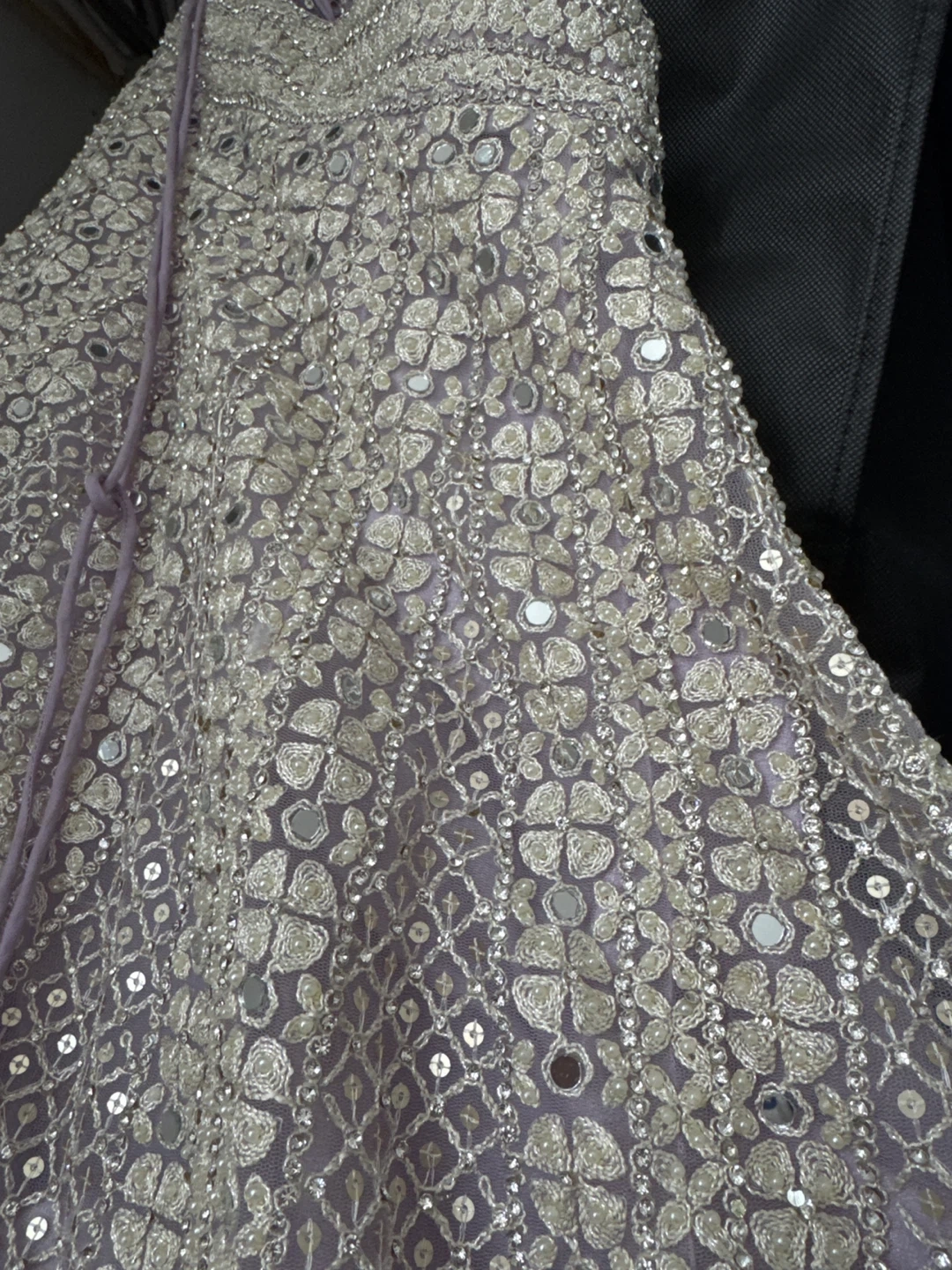 This three-piece Indian outfit includes a heavily embellished lehenga skirt, a matching choli top, and a sheer dupatta. The set is adorned with intricate beadwork, sequins, and mirror accents. The lavender colour and detailed embroidery make it a striking choice for special occasions.
