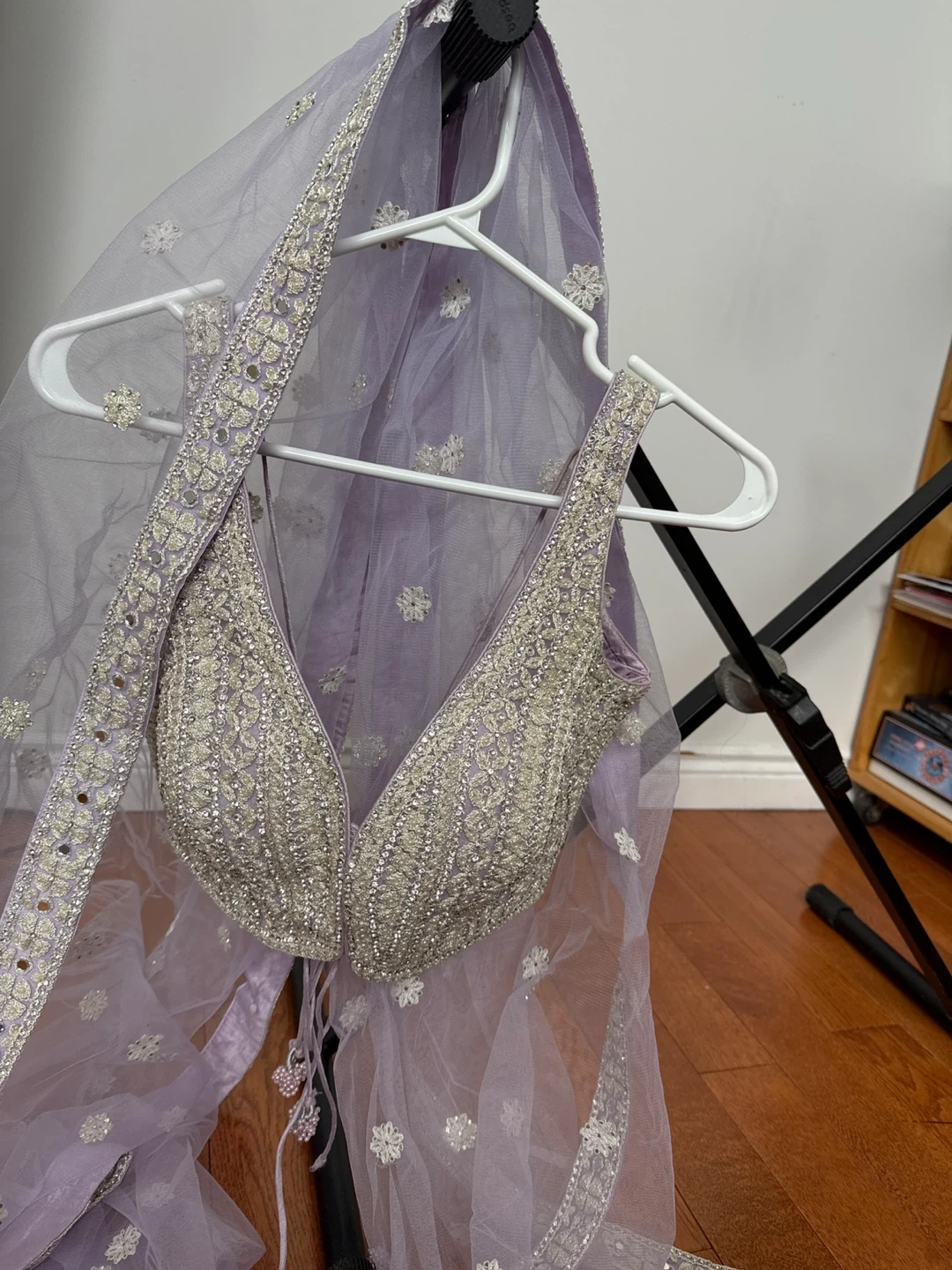 This three-piece Indian outfit includes a heavily embellished lehenga skirt, a matching choli top, and a sheer dupatta. The set is adorned with intricate beadwork, sequins, and mirror accents. The lavender colour and detailed embroidery make it a striking choice for special occasions.