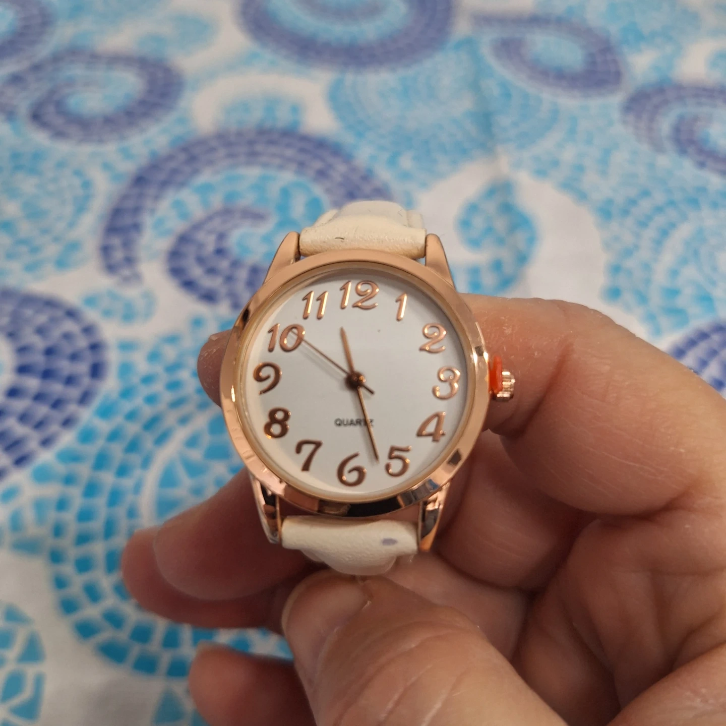 This is a women's quartz wristwatch. It features a rose gold-tone case and a white faux leather band. The white dial has clear Arabic numerals and a second hand.