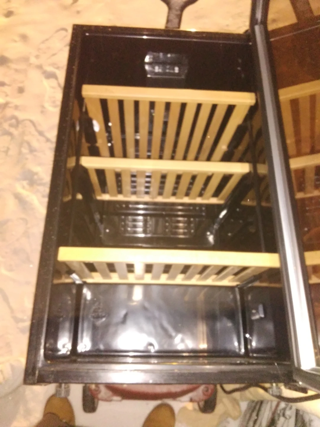 This is a wine fridge cooler with wooden shelves. It has a glass door and a handle on top. It's designed to store your wine bottles.