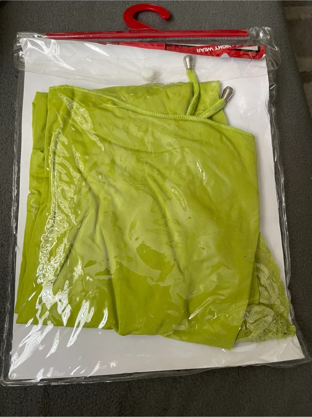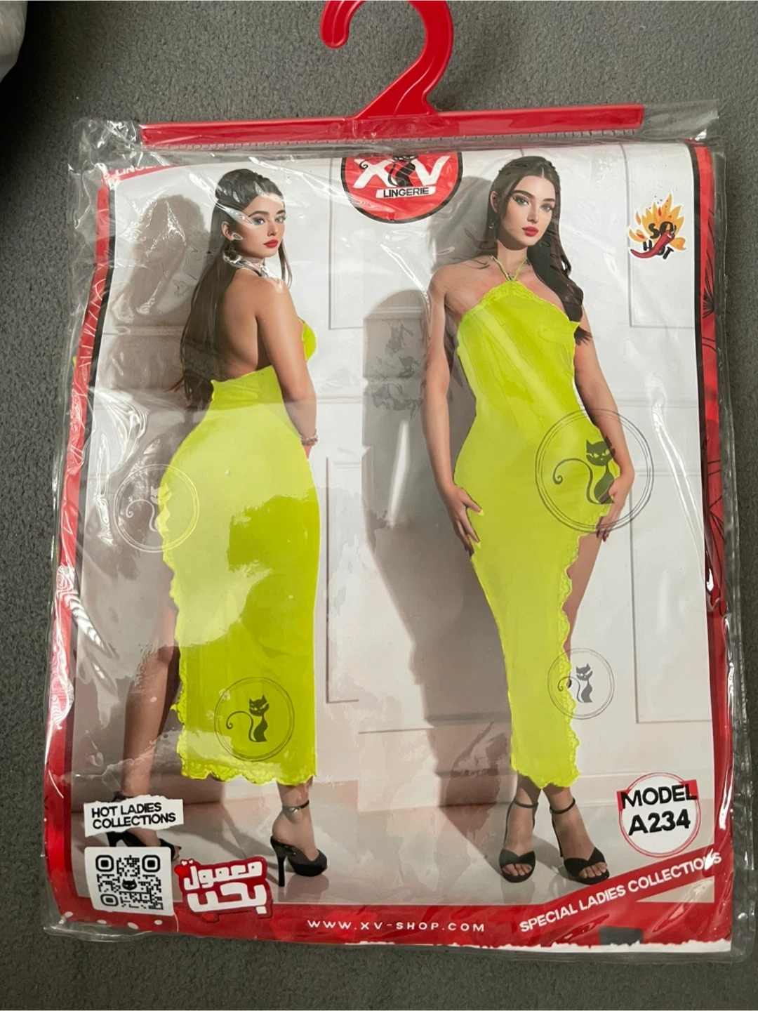 This is a neon green dress from XV Lingerie. It's a stylish piece for special occasions. The fabric is lightweight and has a unique draped design with a high slit. Perfect for a night out!
