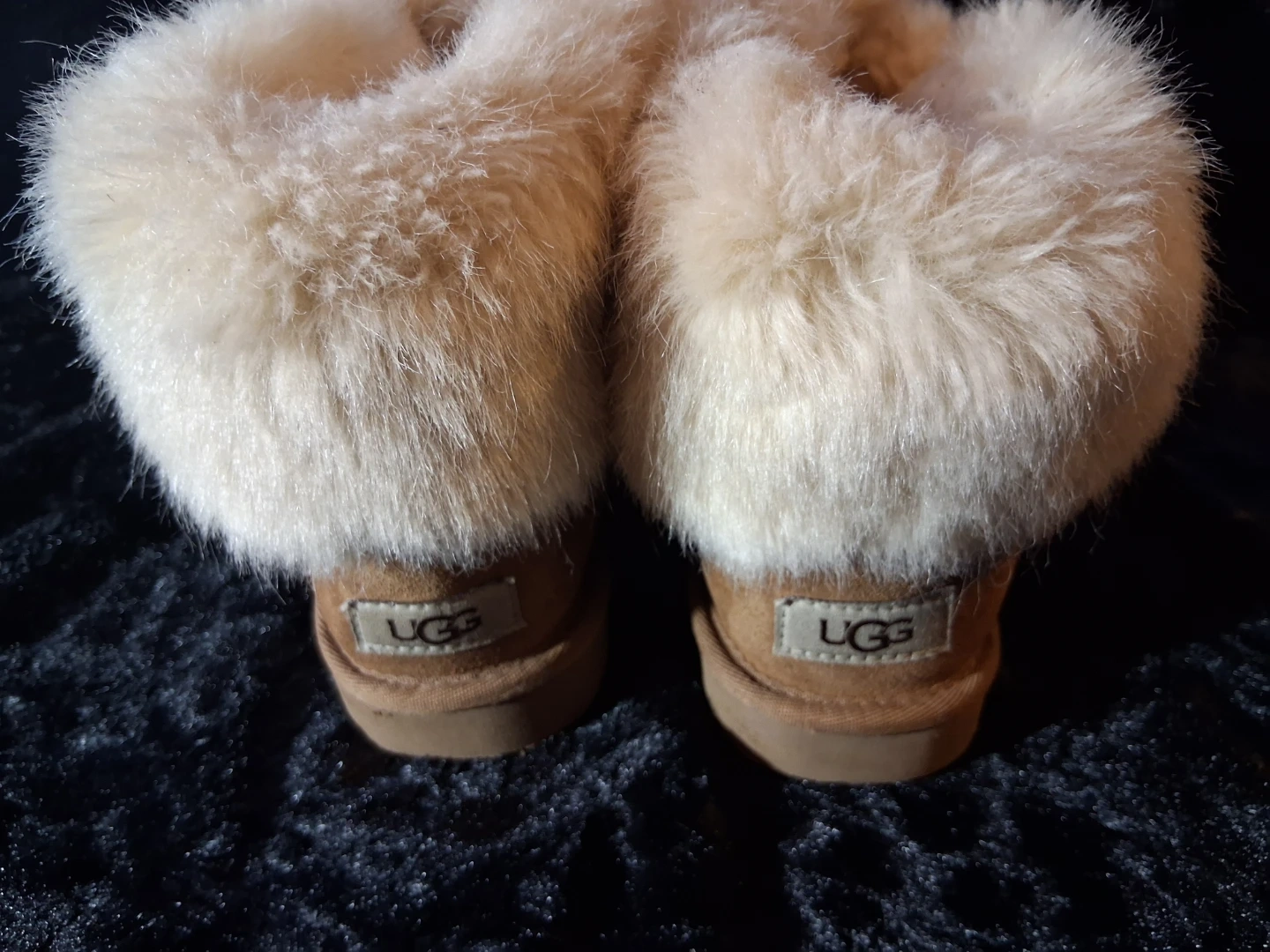 Cozy UGG Australia boots featuring a warm sheepskin lining and fluffy fur trim. These suede boots have a durable sole. They're perfect for keeping your feet warm during colder months!