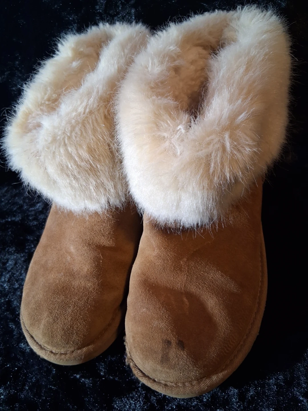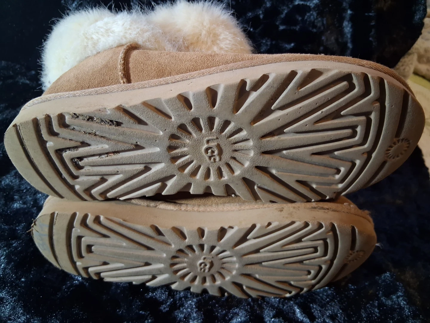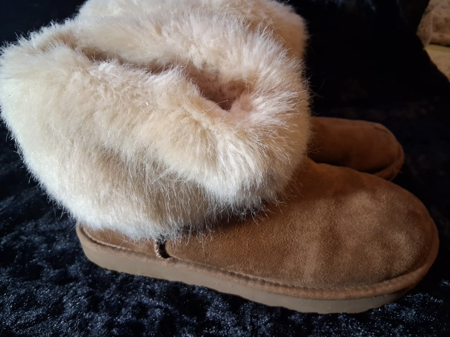 Cozy UGG Australia boots featuring a warm sheepskin lining and fluffy fur trim. These suede boots have a durable sole. They're perfect for keeping your feet warm during colder months!