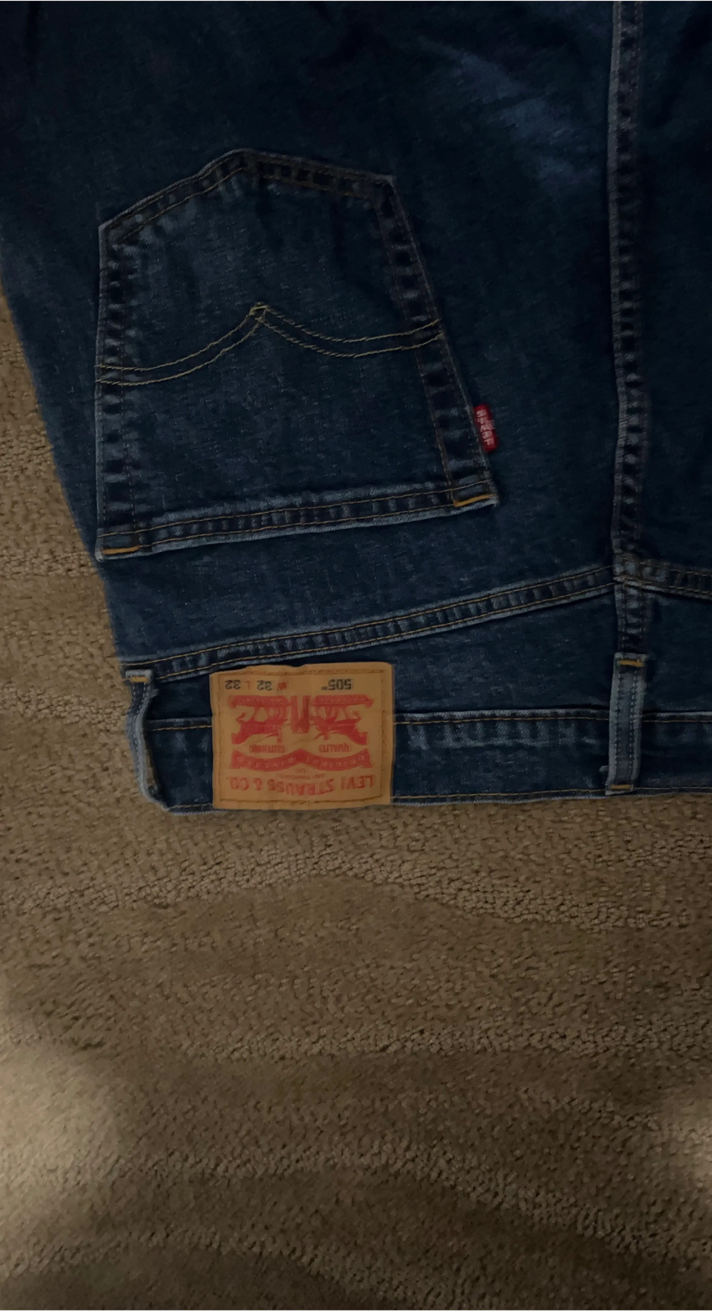 Classic Levi's 505 jeans in a dark wash. Waist size is 32 inches and length is 32 inches. These are made of durable denim. They're a versatile choice for everyday wear!