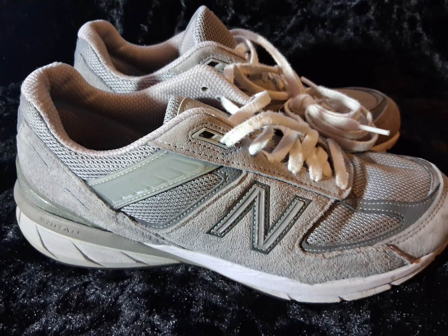 These are New Balance 990V5 running shoes in a light grey color. They feature suede and mesh construction for breathability and support. The ENCAP midsole provides cushioning.