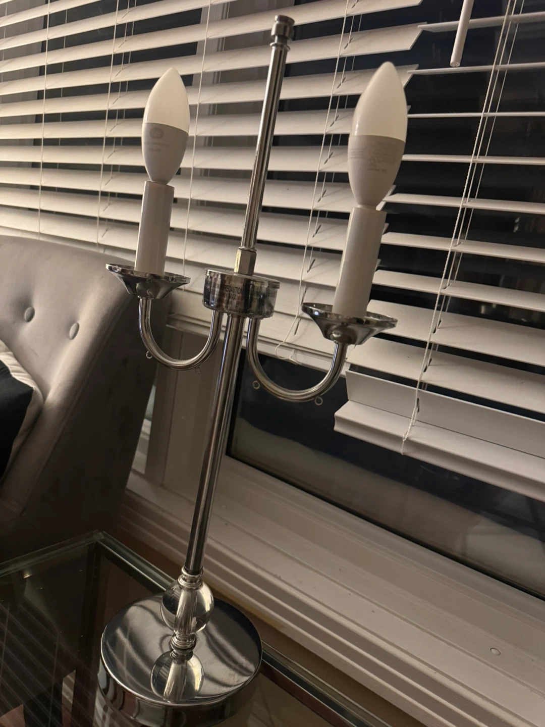 This silver table lamp has a classic design with a grey fabric shade. It's perfect for adding a touch of light to a bedside table or desk. The lamp uses two candelabra bulbs. Need it gone ASAP