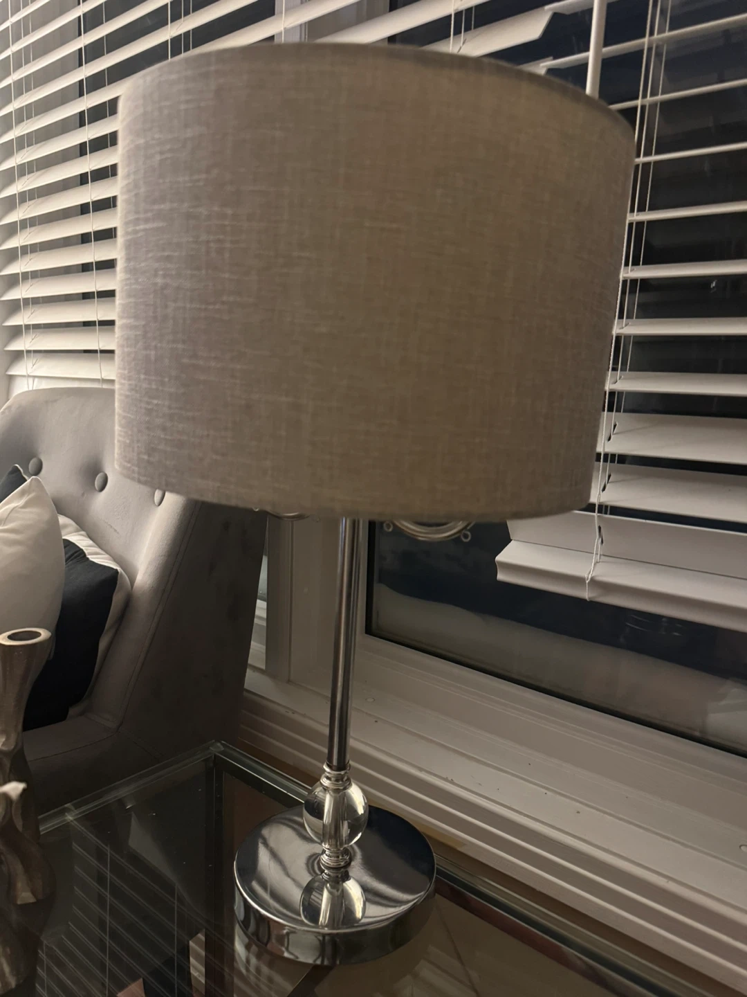 This silver table lamp has a classic design with a grey fabric shade. It's perfect for adding a touch of light to a bedside table or desk. The lamp uses two candelabra bulbs. Need it gone ASAP