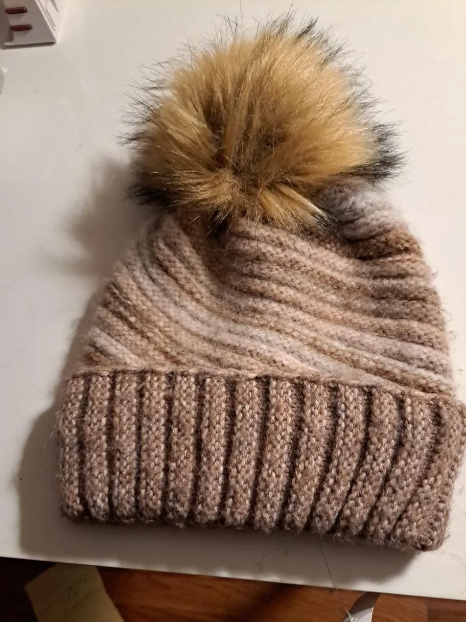This cozy knit beanie features a ribbed cuff and a fluffy faux fur pom pom. It's a stylish accessory for colder weather. The yarn has a marled brown and cream colour pattern.