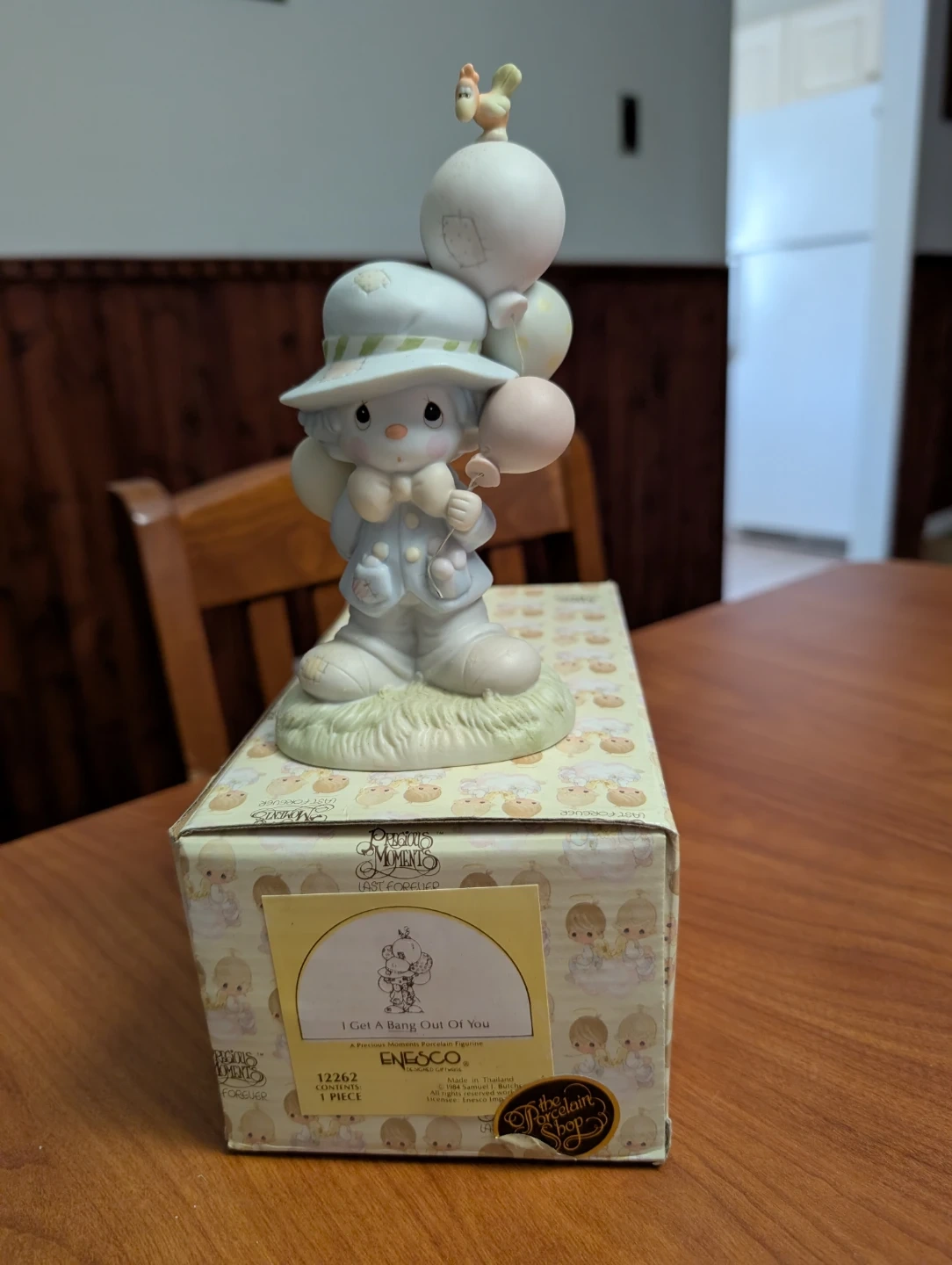 This is a Precious Moments porcelain figurine titled "I Get A Bang Out Of You". It depicts a character holding several balloons, with a small bird on top of one. Includes original box.