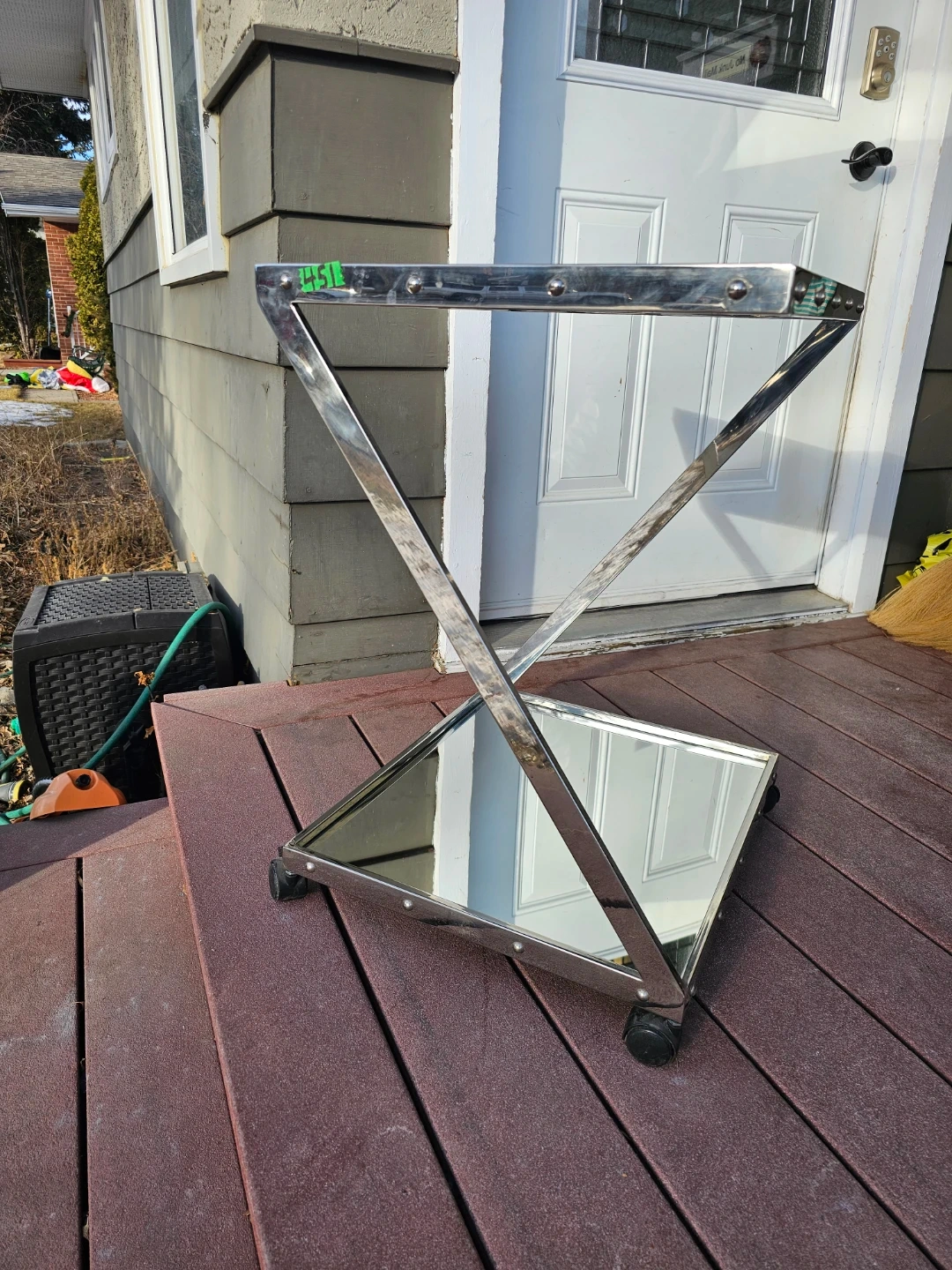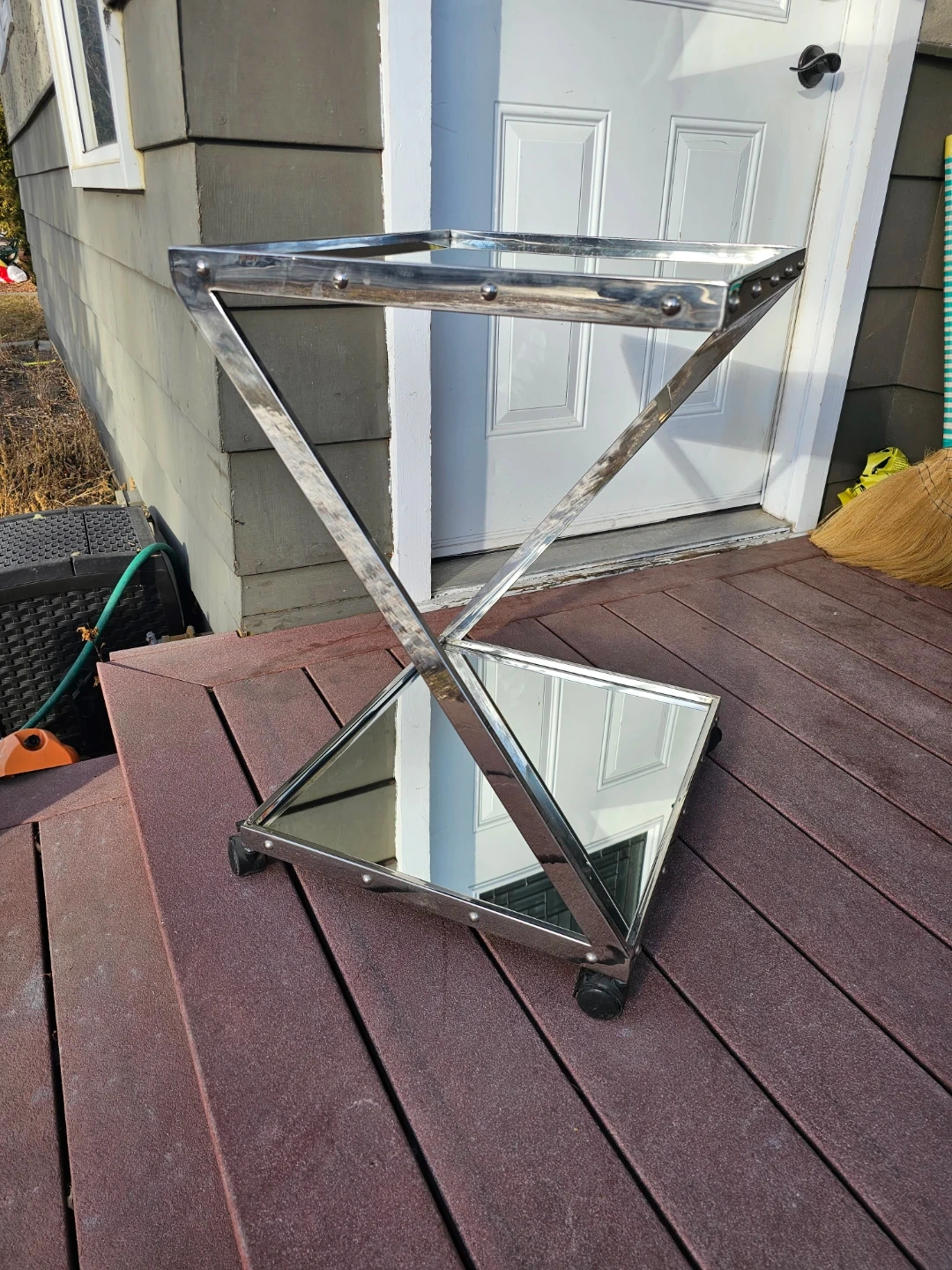 Two-tiered bar cart with chrome frame and mirrored surfaces. It features a stylish geometric design and four wheels for easy mobility. Perfect for serving drinks or displaying items.