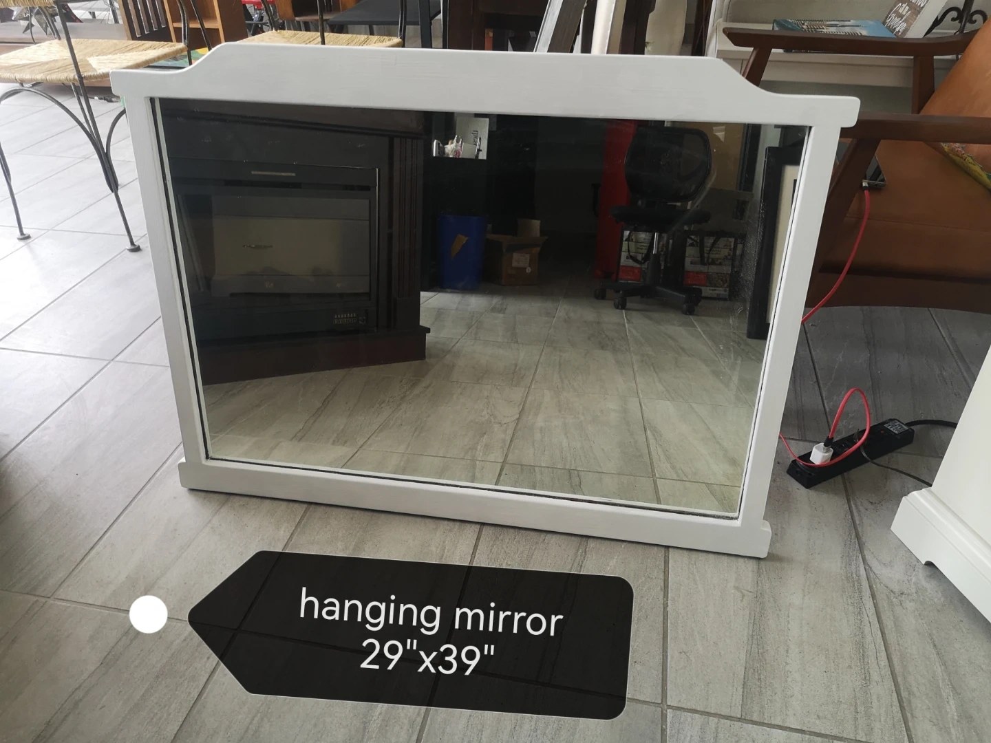 This is a used hanging mirror, measuring 29" x 39". It has a white frame and is in good condition.color prime. so paint any color you want It's perfect for adding a touch of elegance to any room.