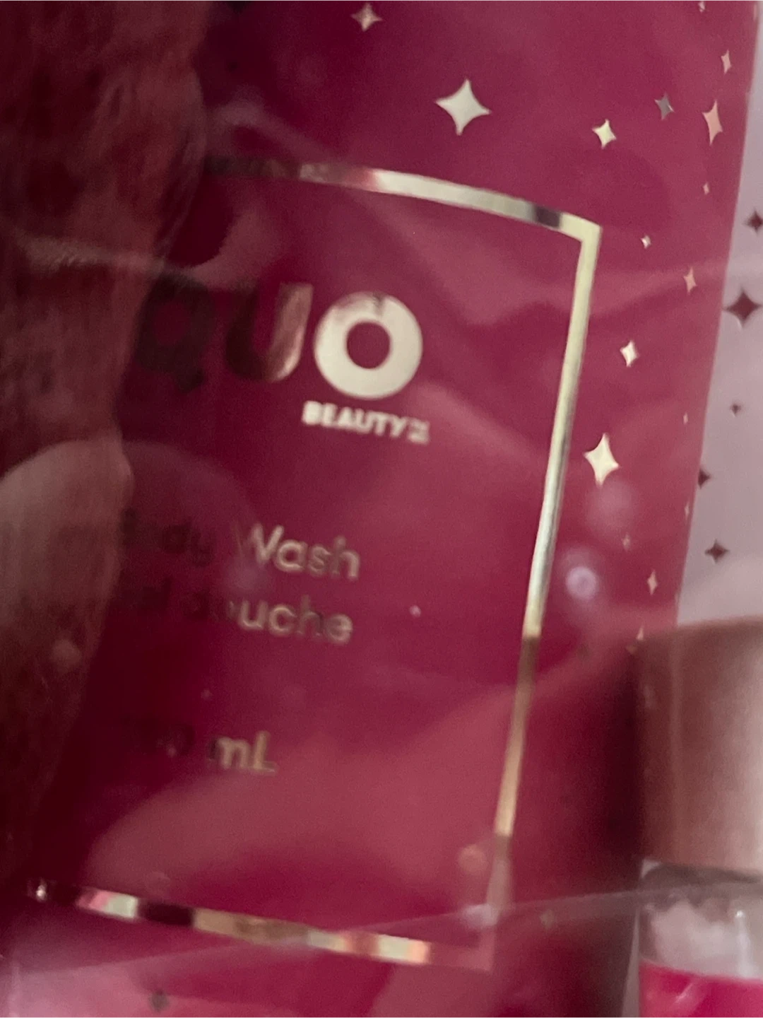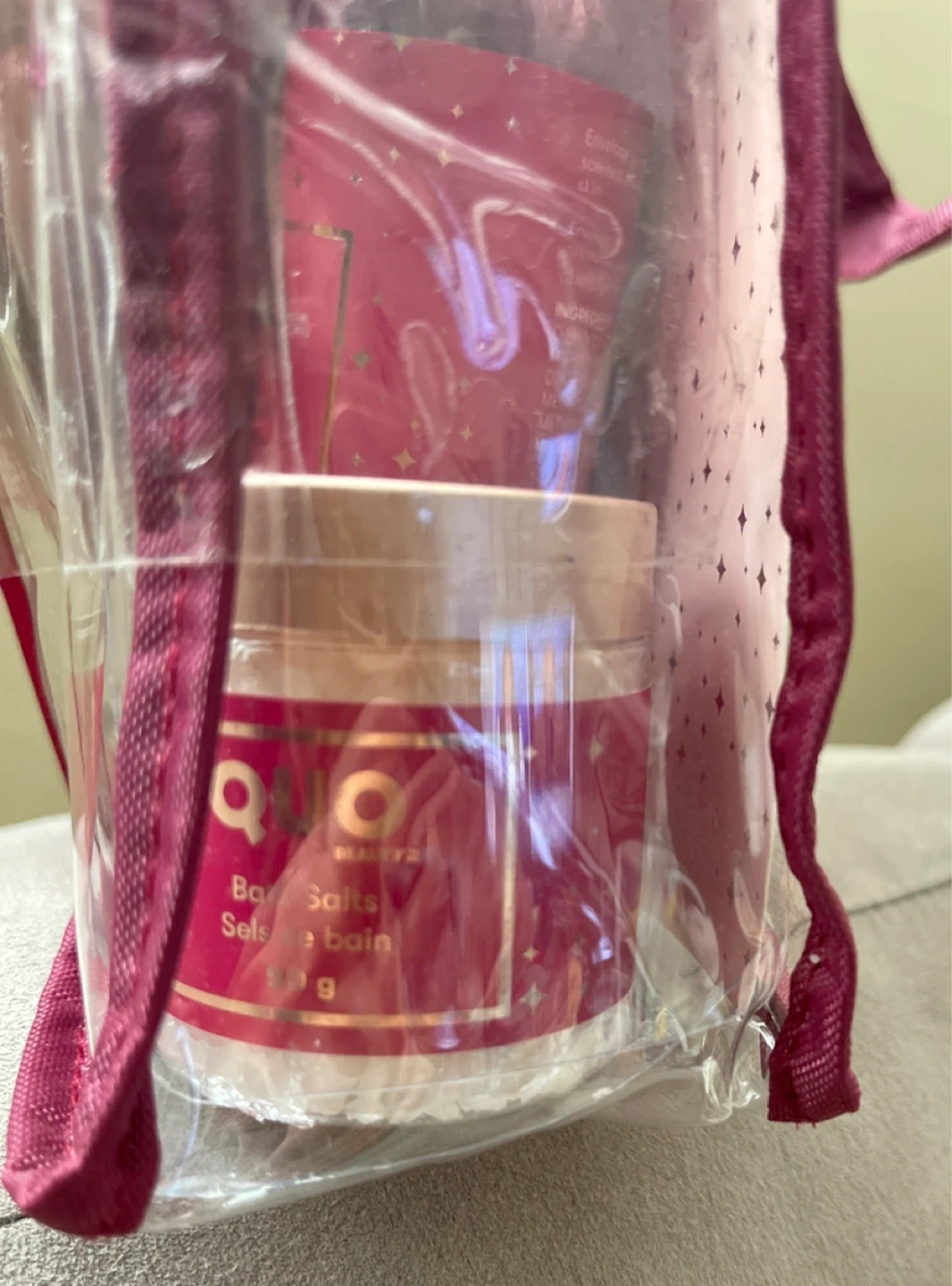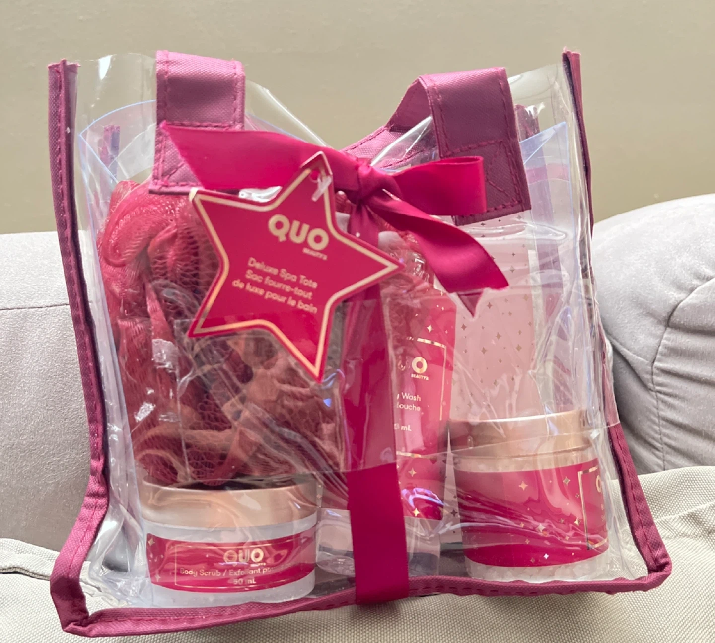 This QUO Beauty gift set comes with a body wash, body scrub, and bath salts. It also includes a bath puff for a complete spa experience. Perfect for a relaxing at-home spa day!