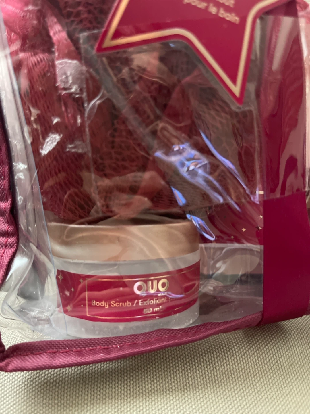 This QUO Beauty gift set comes with a body wash, body scrub, and bath salts. It also includes a bath puff for a complete spa experience. Perfect for a relaxing at-home spa day!