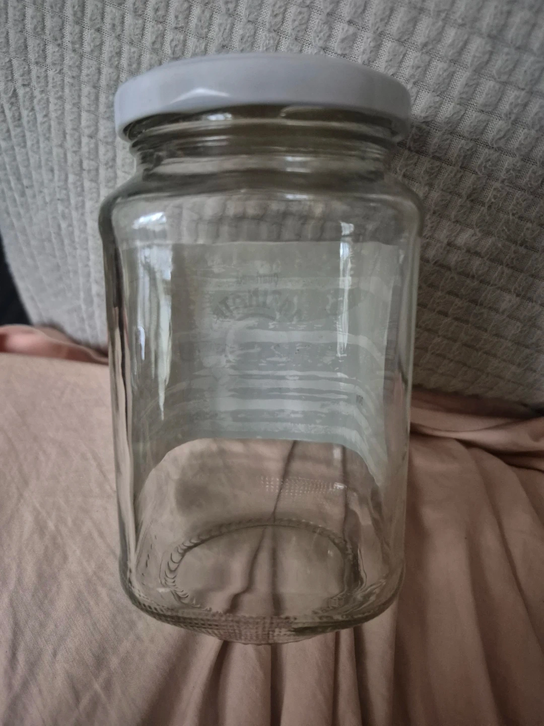 This is a clear glass jar with a white lid. It's suitable for storing food items or other small goods. The jar's material is glass.