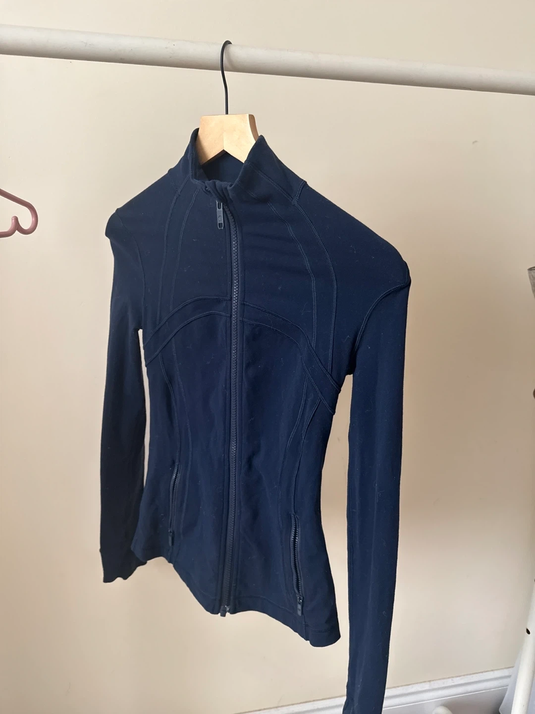 This Lululemon jacket is navy blue and features a full zip closure. It's designed with a fitted silhouette and long sleeves. It's a versatile piece for active or casual wear.