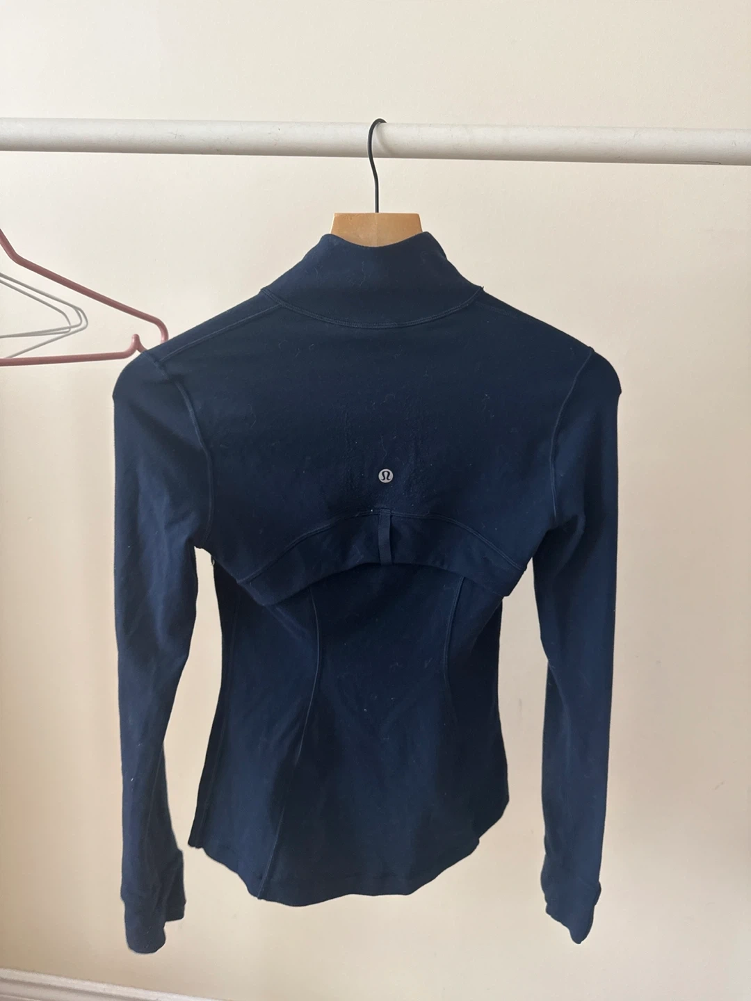 This Lululemon jacket is navy blue and features a full zip closure. It's designed with a fitted silhouette and long sleeves. It's a versatile piece for active or casual wear.