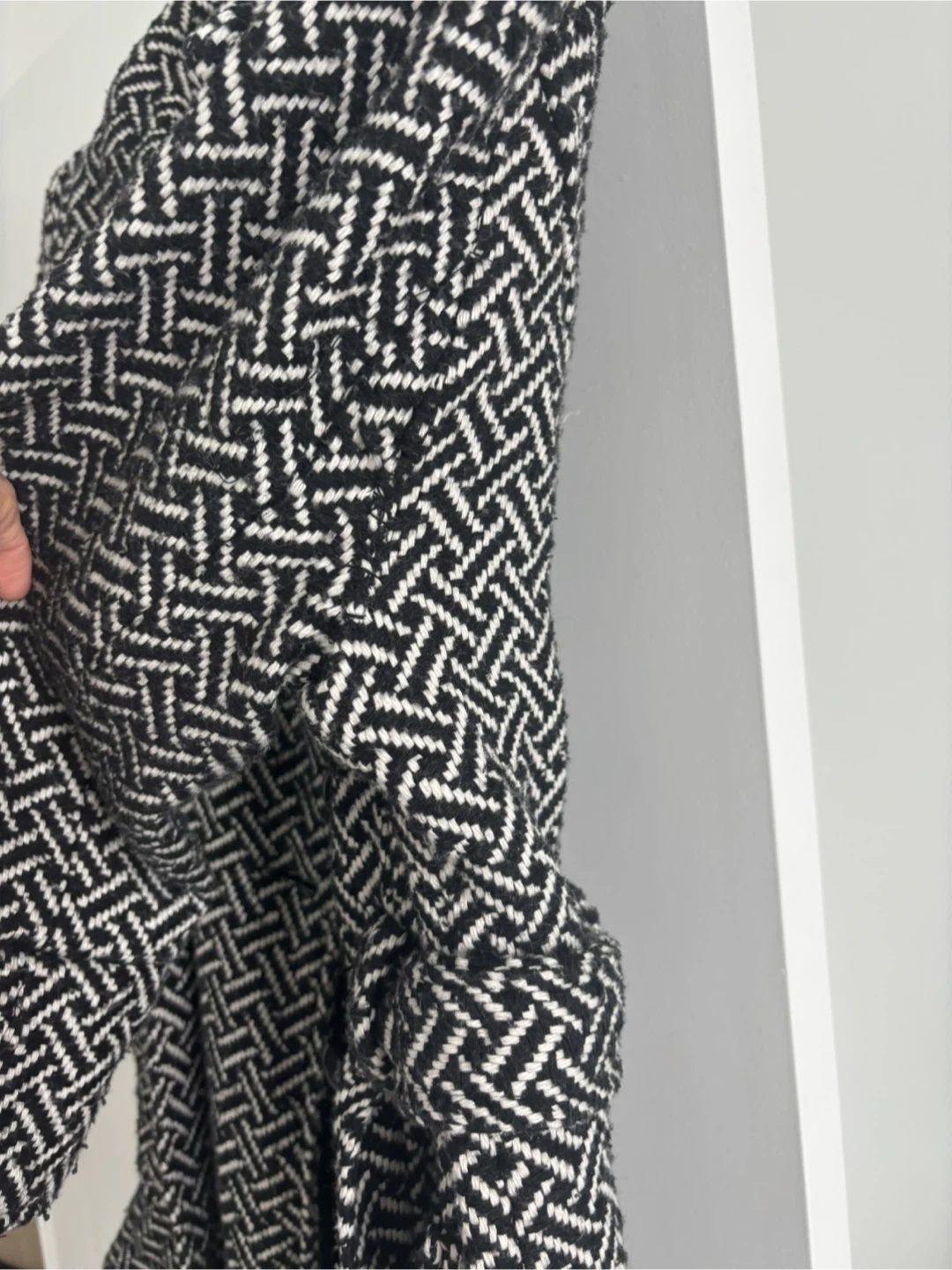 This Luii coat features a stylish black and white herringbone pattern. It's a size medium and made with 100% polyester. The coat is double-breasted with black buttons. Perfect for layering during cooler weather!