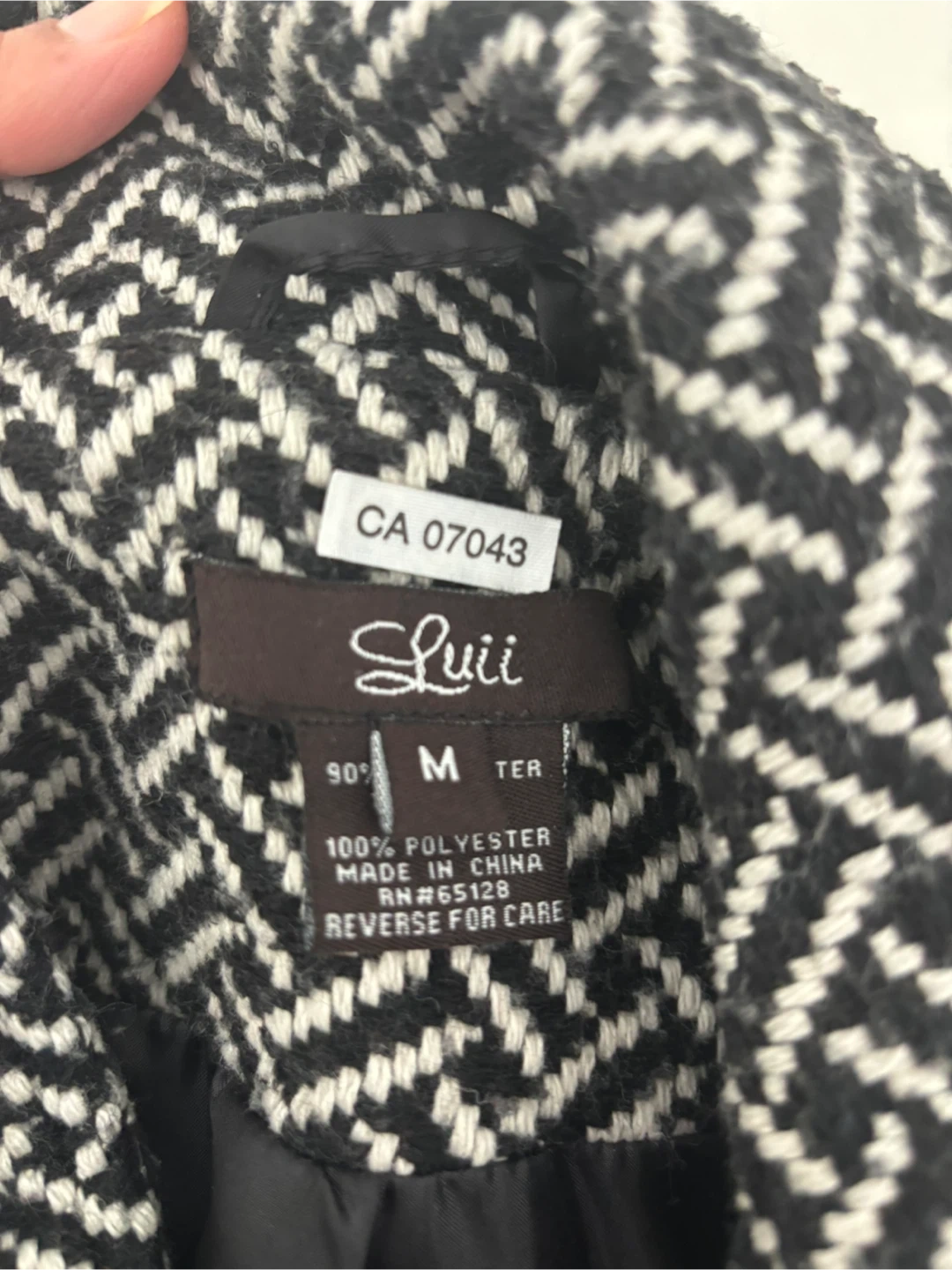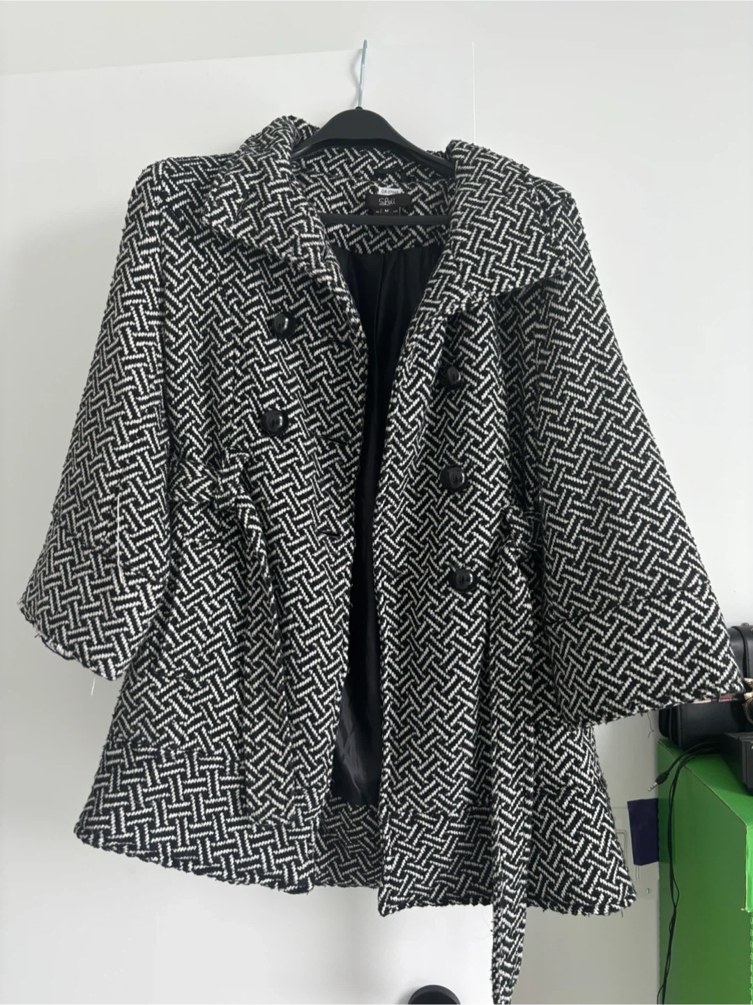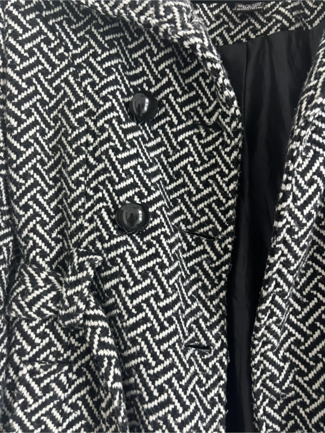 This Luii coat features a stylish black and white herringbone pattern. It's a size medium and made with 100% polyester. The coat is double-breasted with black buttons. Perfect for layering during cooler weather!