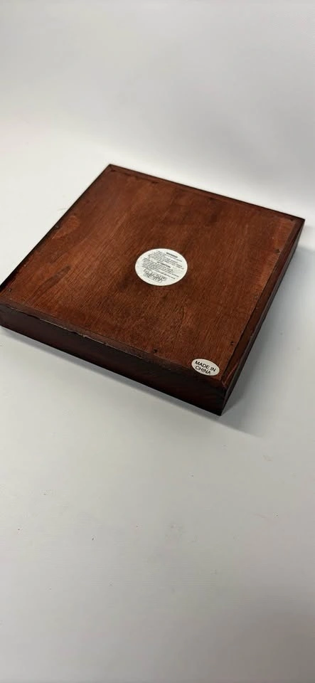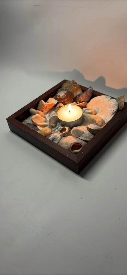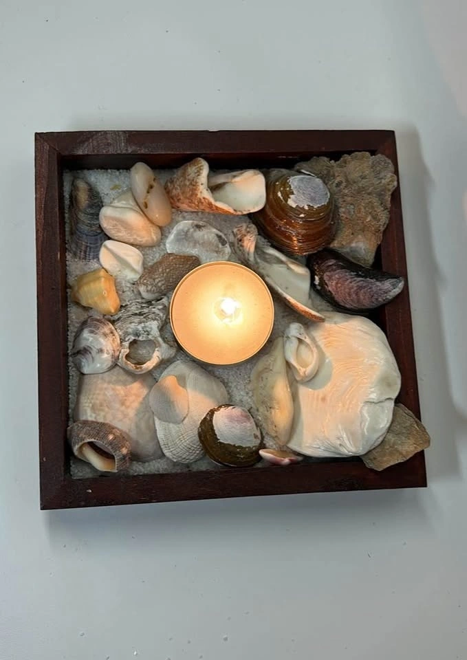 Many different beach shells, coarse white sand, new candle, and wooden square frame.