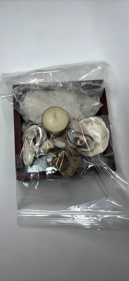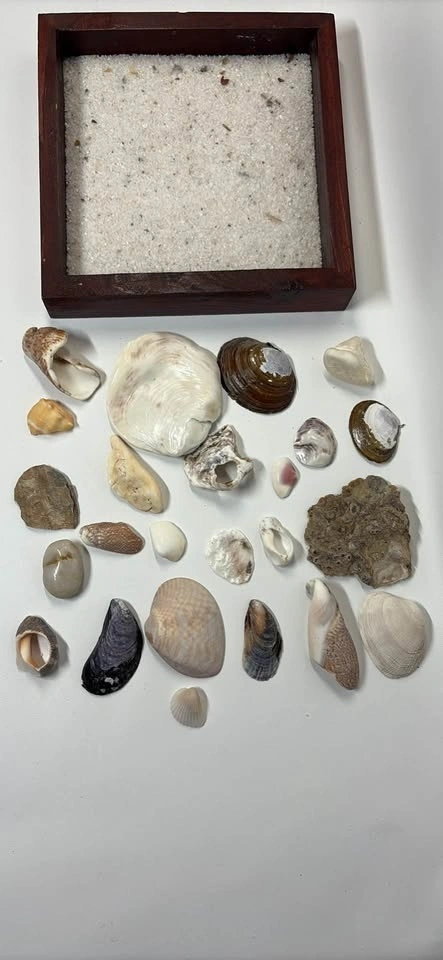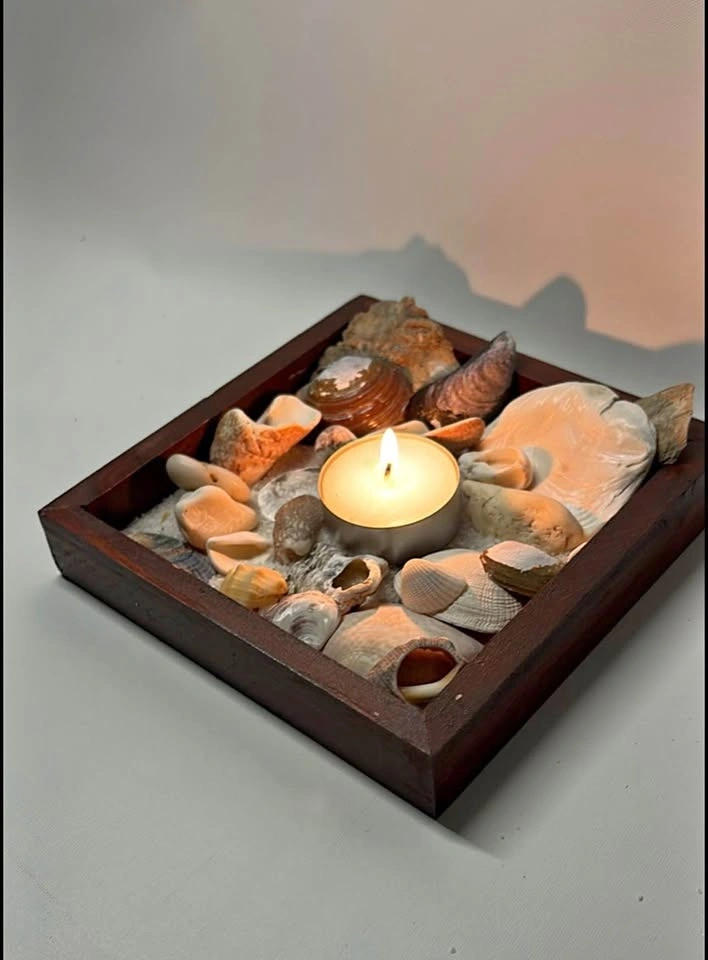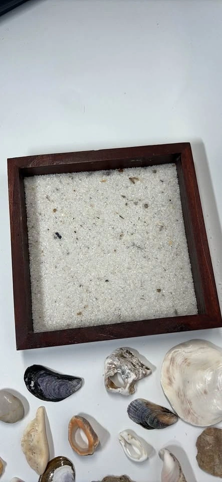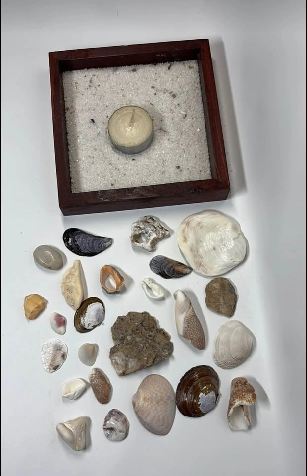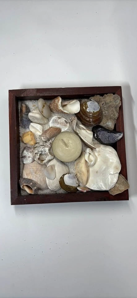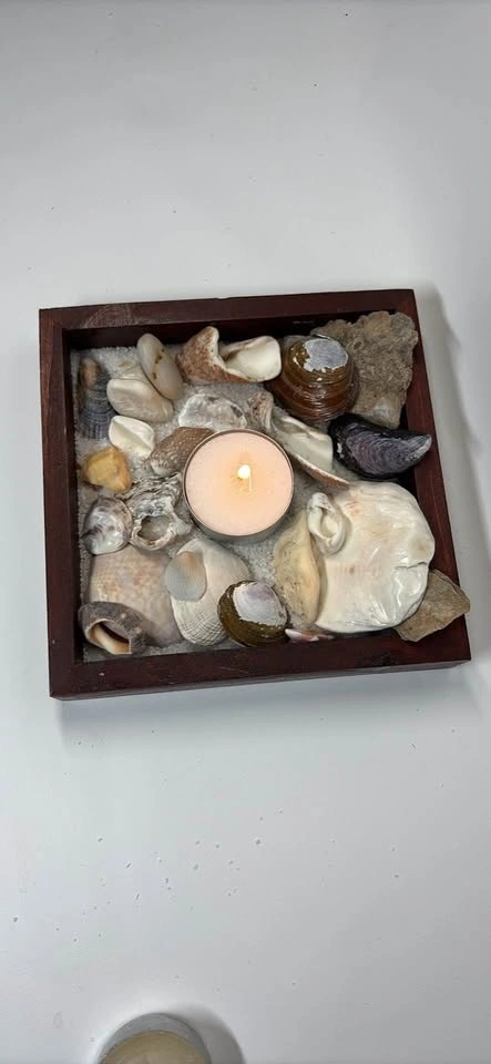 Many different beach shells, coarse white sand, new candle, and wooden square frame.