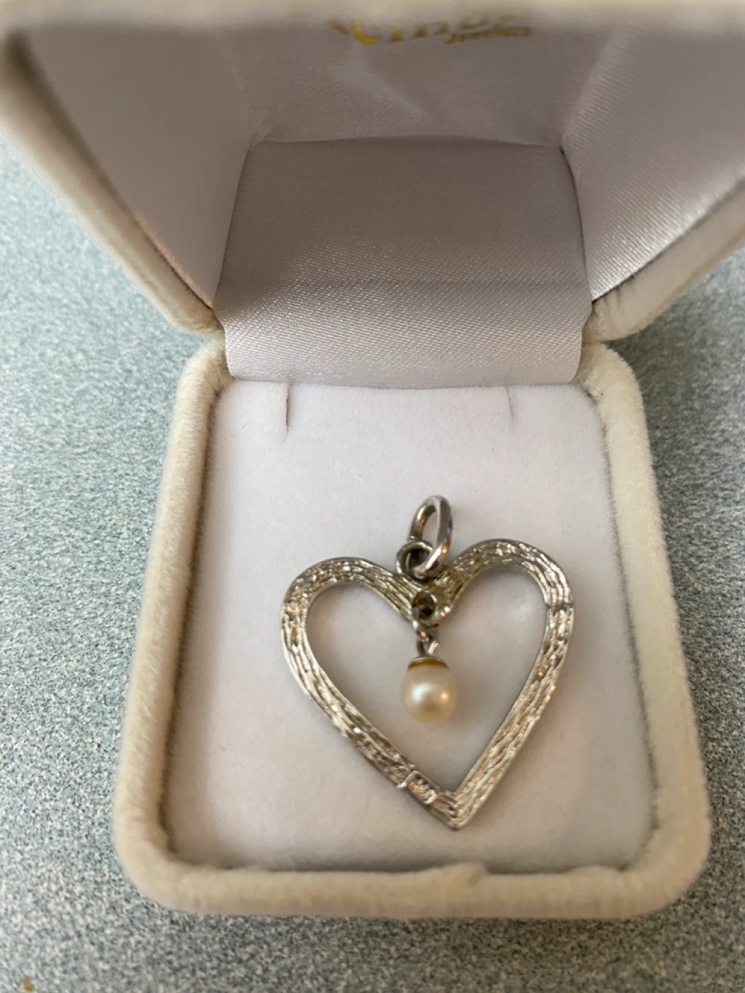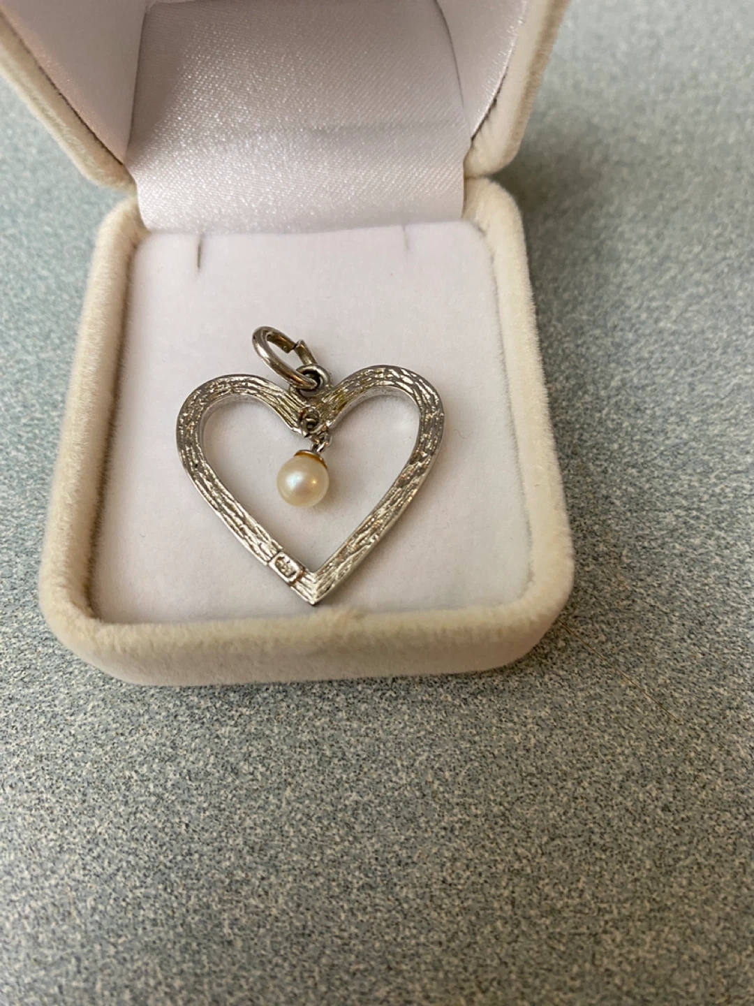 935 stamped silverheart-shaped pendant. It features a small pearl dangling inside the heart. The pendant comes in a velvet jewellery box.