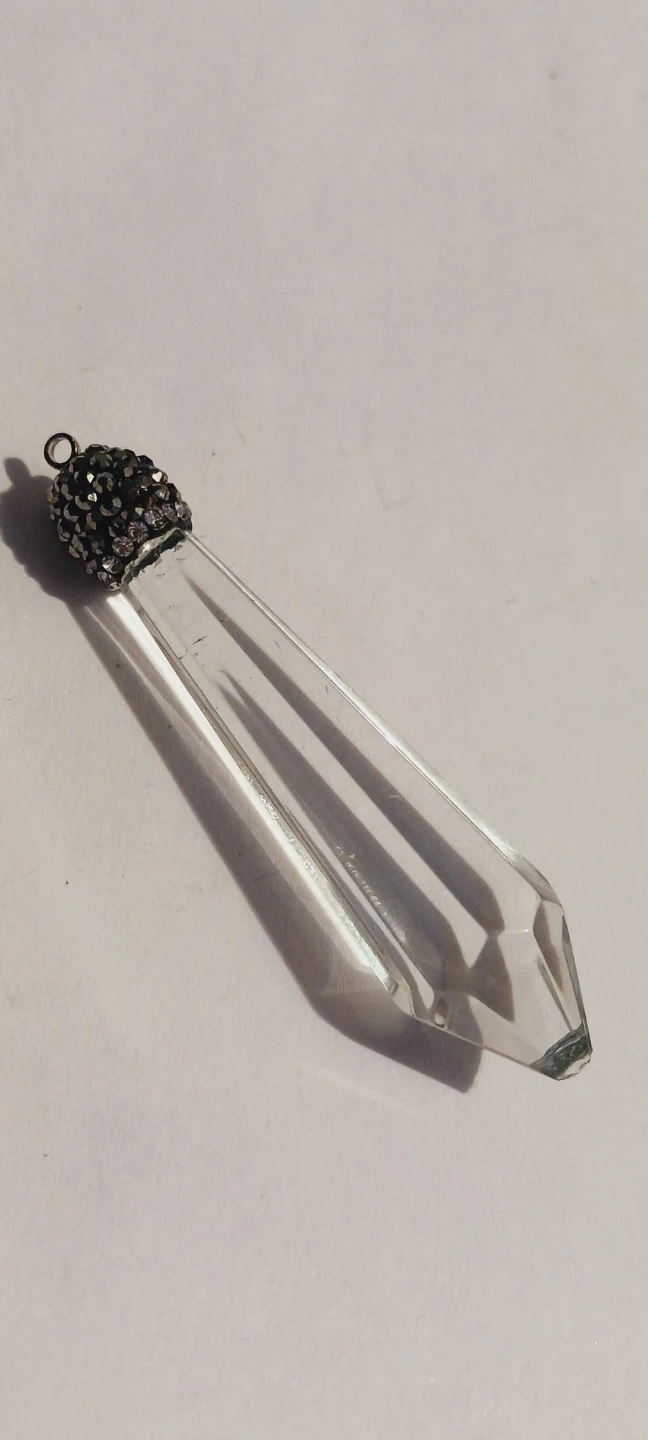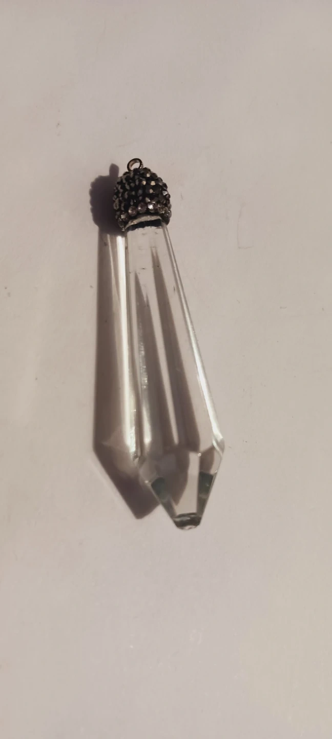 This pendant features a clear, faceted crystal drop. It has a decorative cap adorned with small, sparkling stones. It's designed to hang and catch the light beautifully! 2.5" long. Excellent condition.