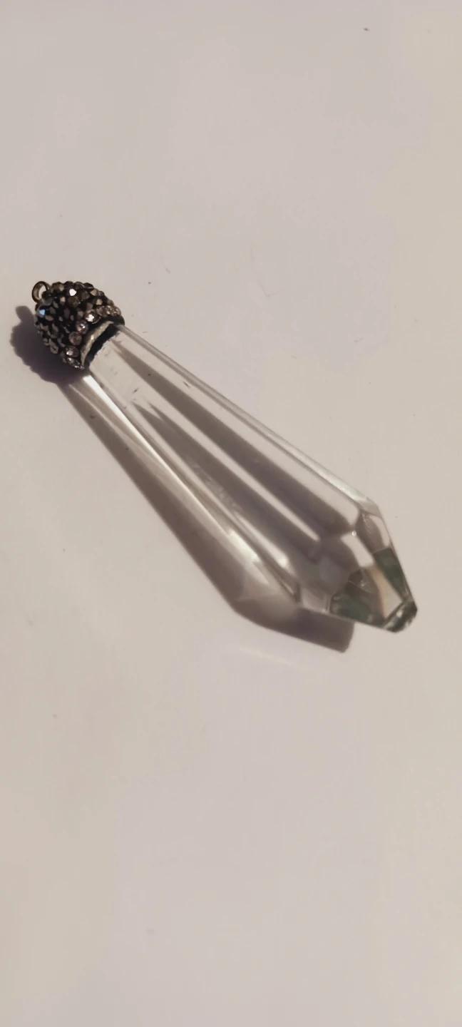 This pendant features a clear, faceted crystal drop. It has a decorative cap adorned with small, sparkling stones. It's designed to hang and catch the light beautifully! 2.5" long. Excellent condition.