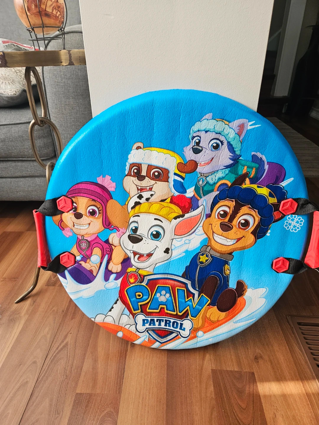 Get ready for winter fun with this Paw Patrol round snow sled! It features all your favourite pups from the show. Durable construction for downhill adventures. 6 years old plus , Maximum capacity weight 220.46 lb.