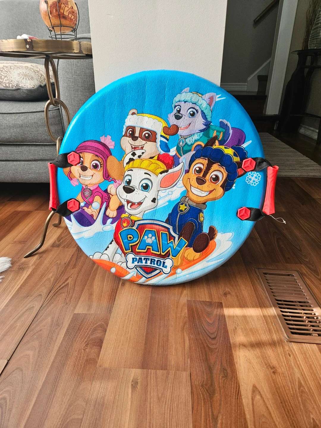 Get ready for winter fun with this Paw Patrol round snow sled! It features all your favourite pups from the show. Durable construction for downhill adventures. 6 years old plus , Maximum capacity weight 220.46 lb.