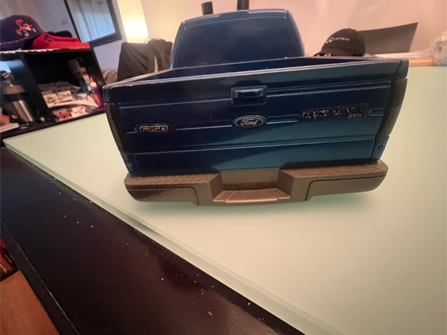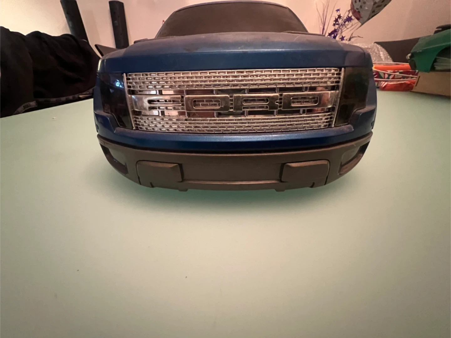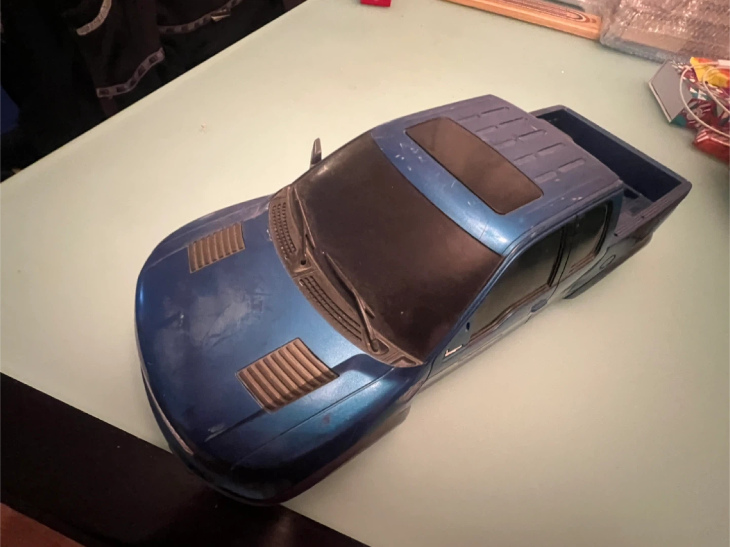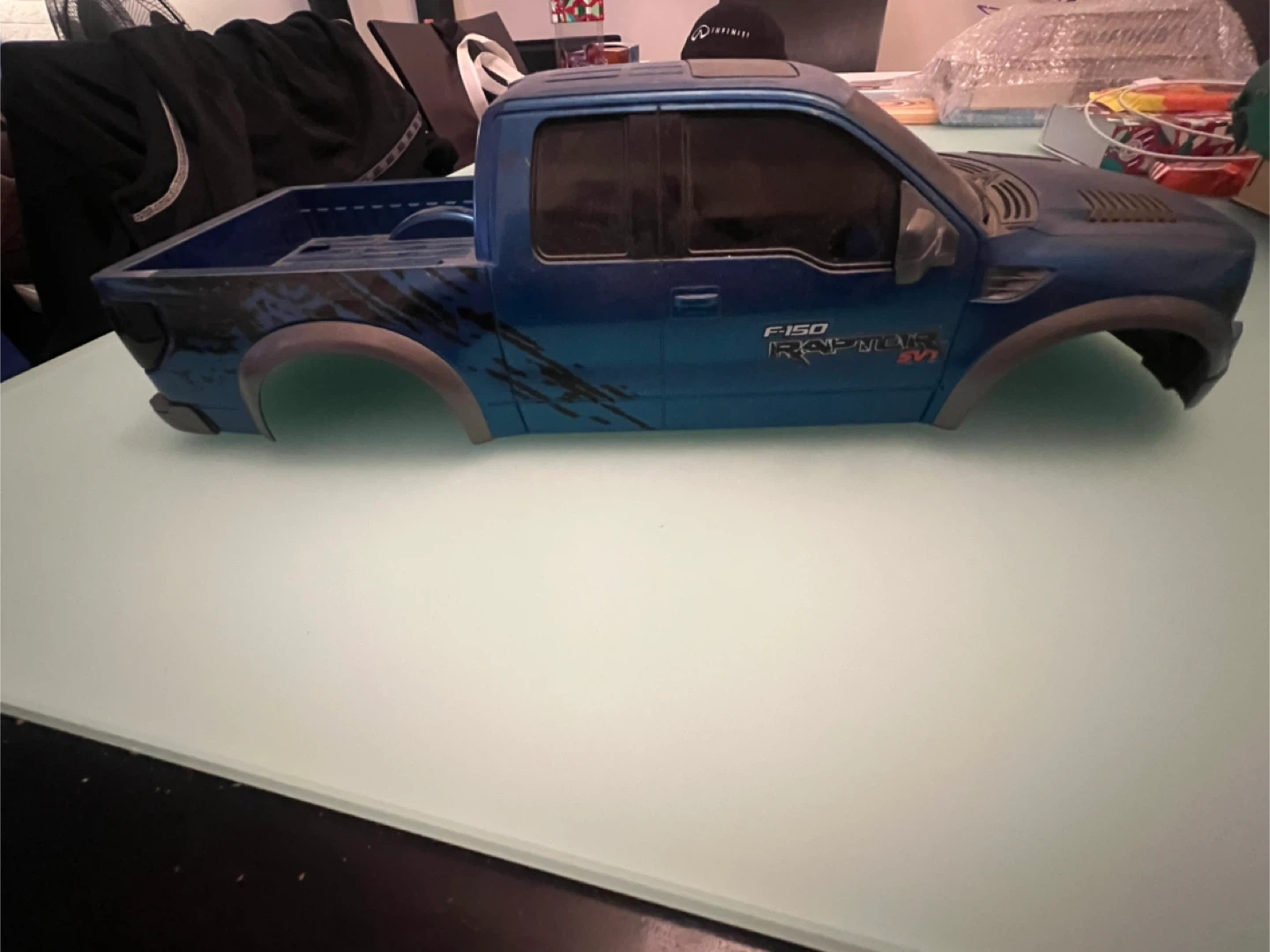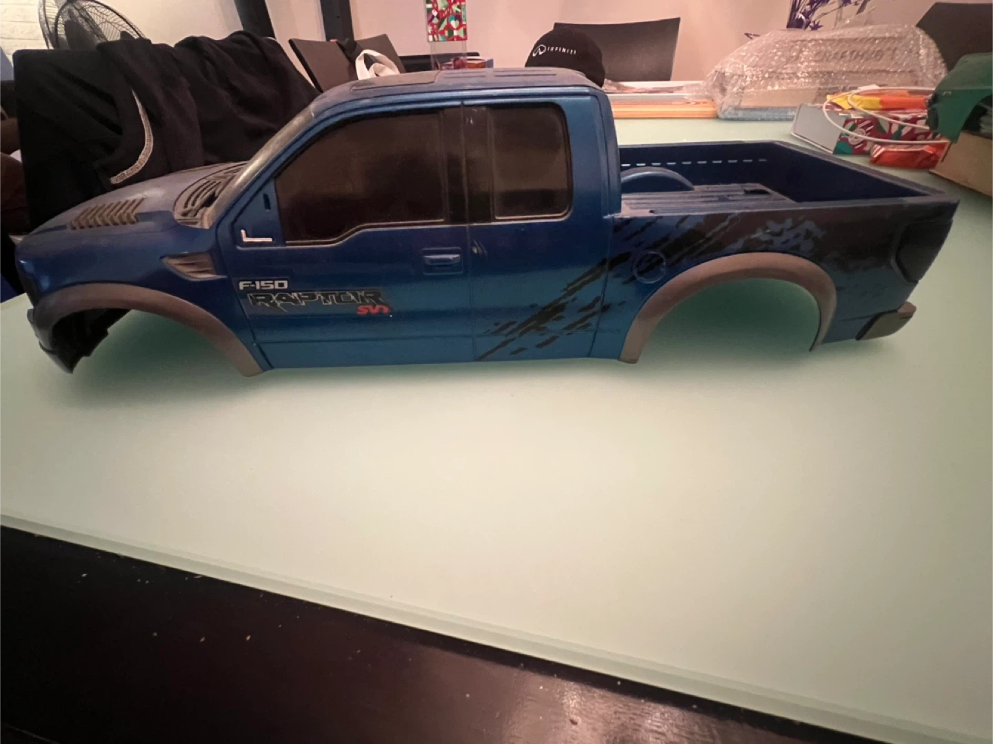 Blue Ford F-150 Raptor SVT RC car body shell. Features a detailed grille and fender flares. Perfect for replacing or customizing your RC truck. No holes have been cut in the body. It was taken off a toy I bought so I could put it on 1/10 R/C chassis.