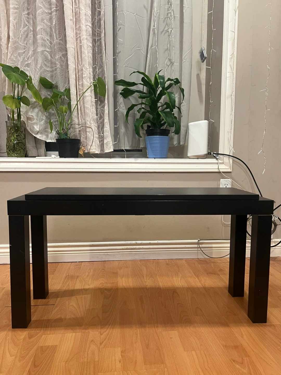 Simple black coffee table. It's rectangular with four sturdy legs. The surface is flat and smooth. This table is great for living rooms or dens.