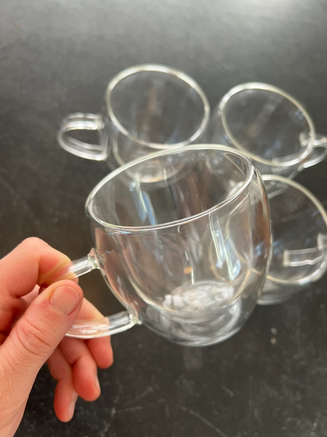Four clear glass mugs with double-wall construction. These mugs are great for keeping drinks hot or cold. Dishwasher safe.