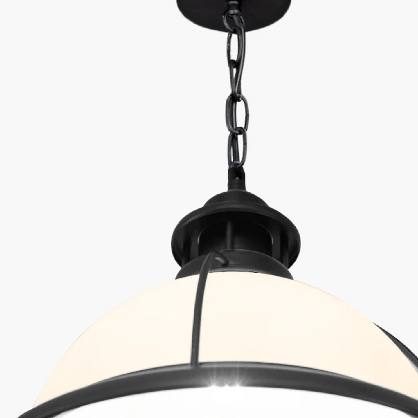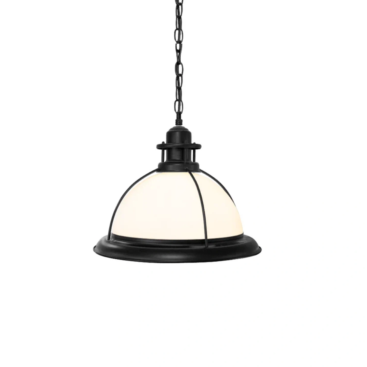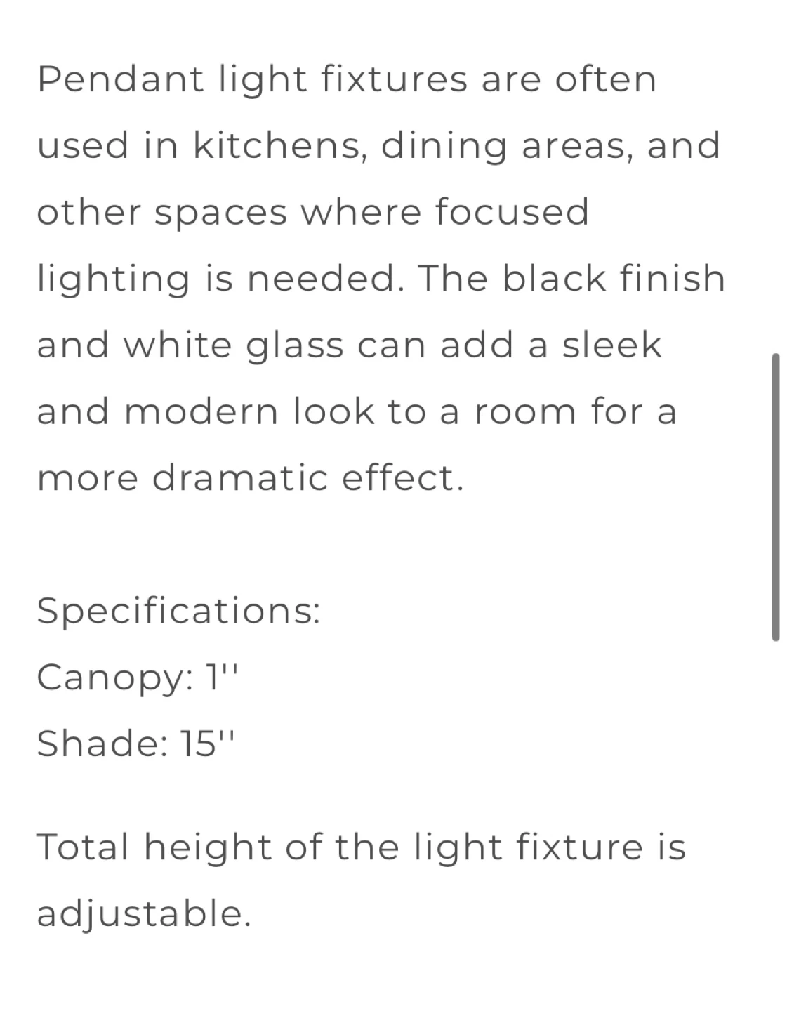 This is a pendant light from Designers Warehouse. It's a black metal fixture with a white dome shade. It comes with a chain for hanging. This retails for $517.00 each. I have 2 available