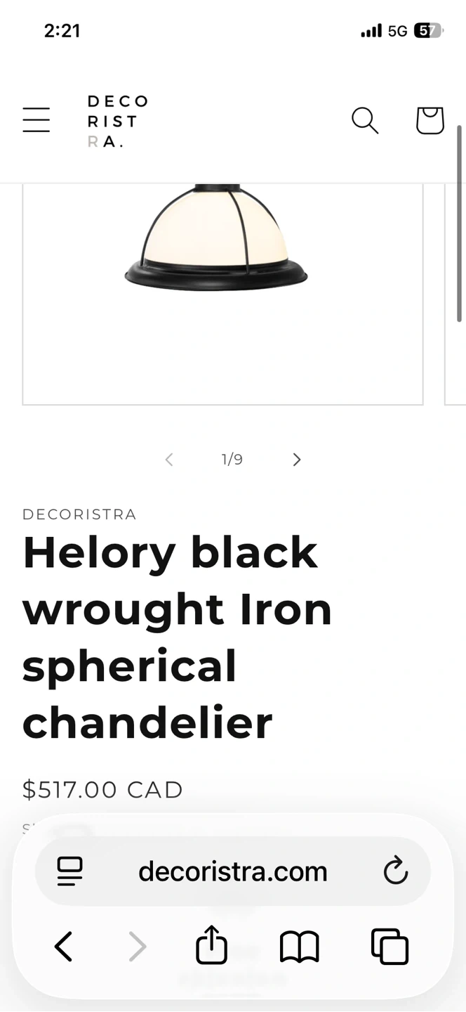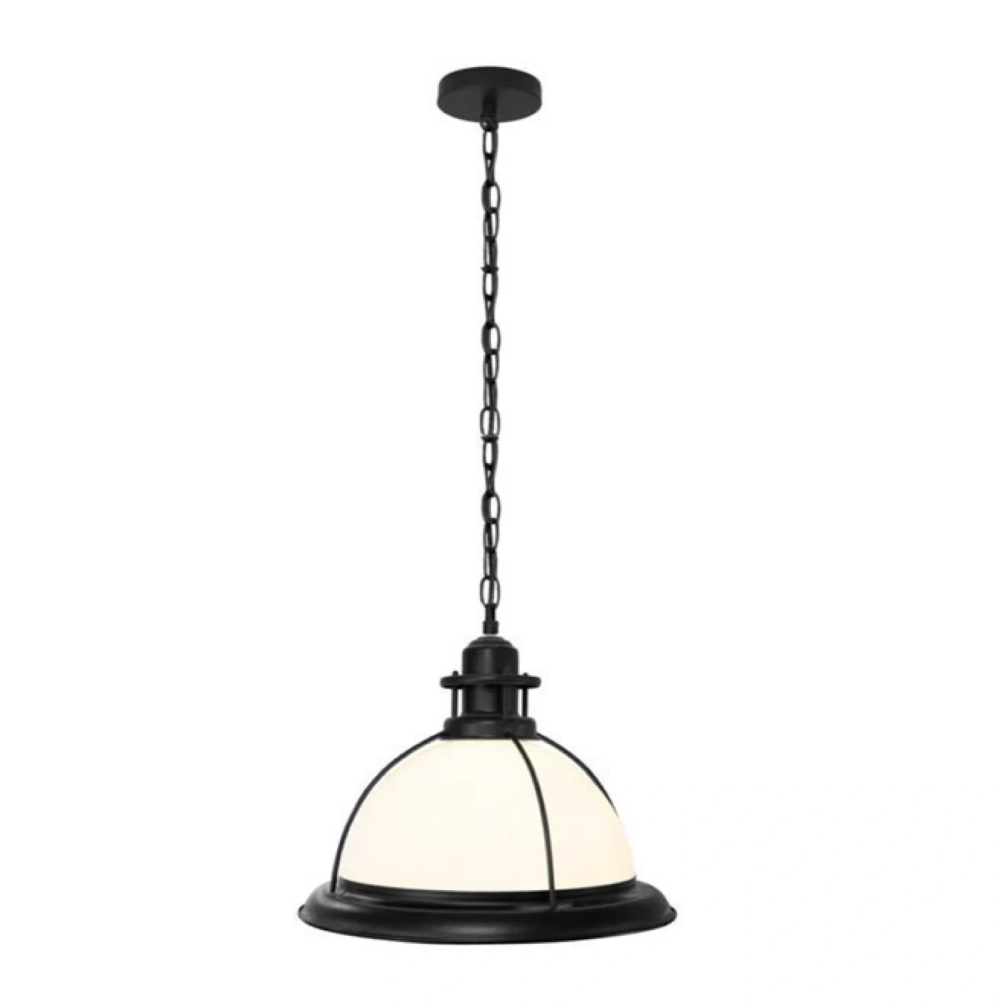 This is a pendant light from Designers Warehouse. It's a black metal fixture with a white dome shade. It comes with a chain for hanging. This retails for $517.00 each. I have 2 available