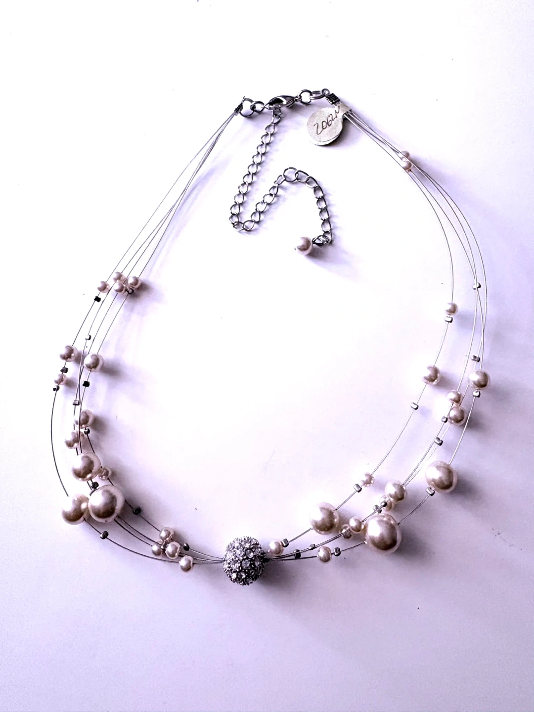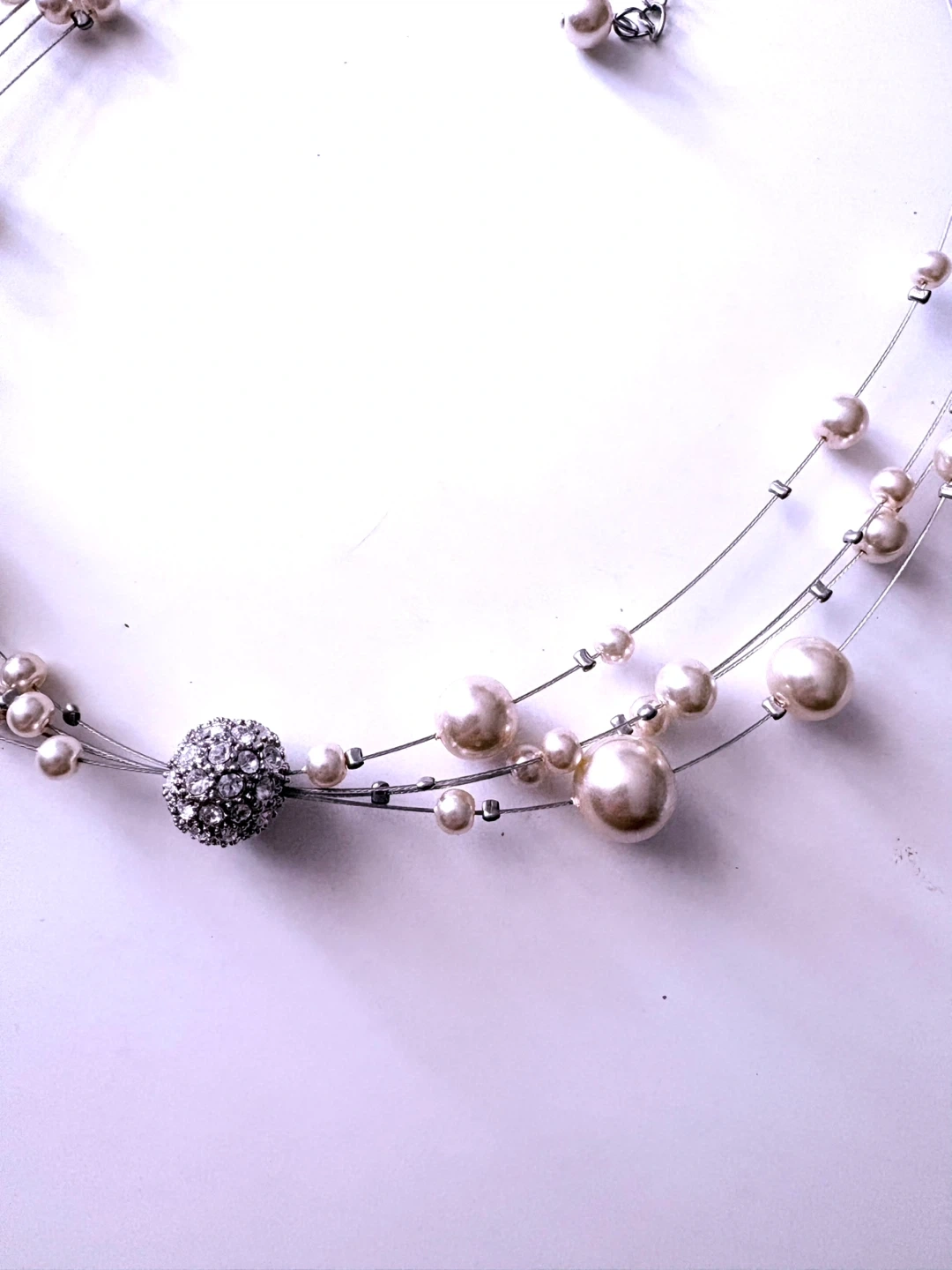 Brand new white pearl three layer illusion necklace with large bead with crystals. Boutique jewelry.