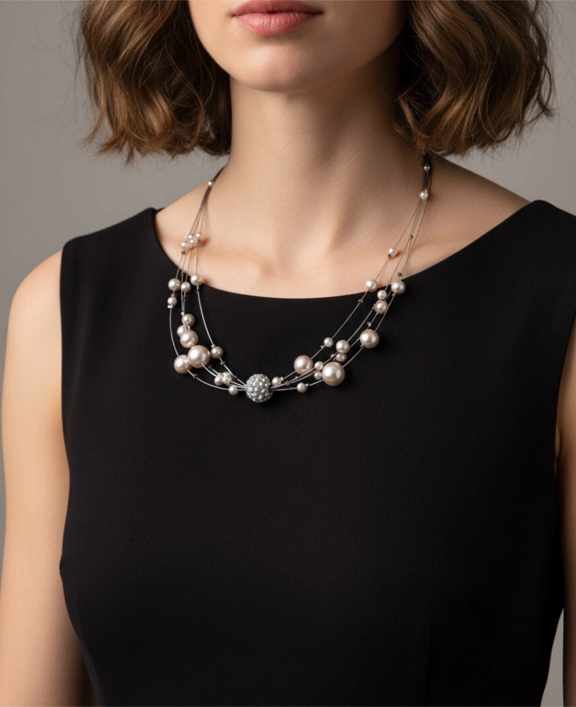 This three strands necklace features a mix of faux pearls in varying sizes. A sparkly rhinestone-encrusted bead is the central accent. It's adjustable for a perfect fit!