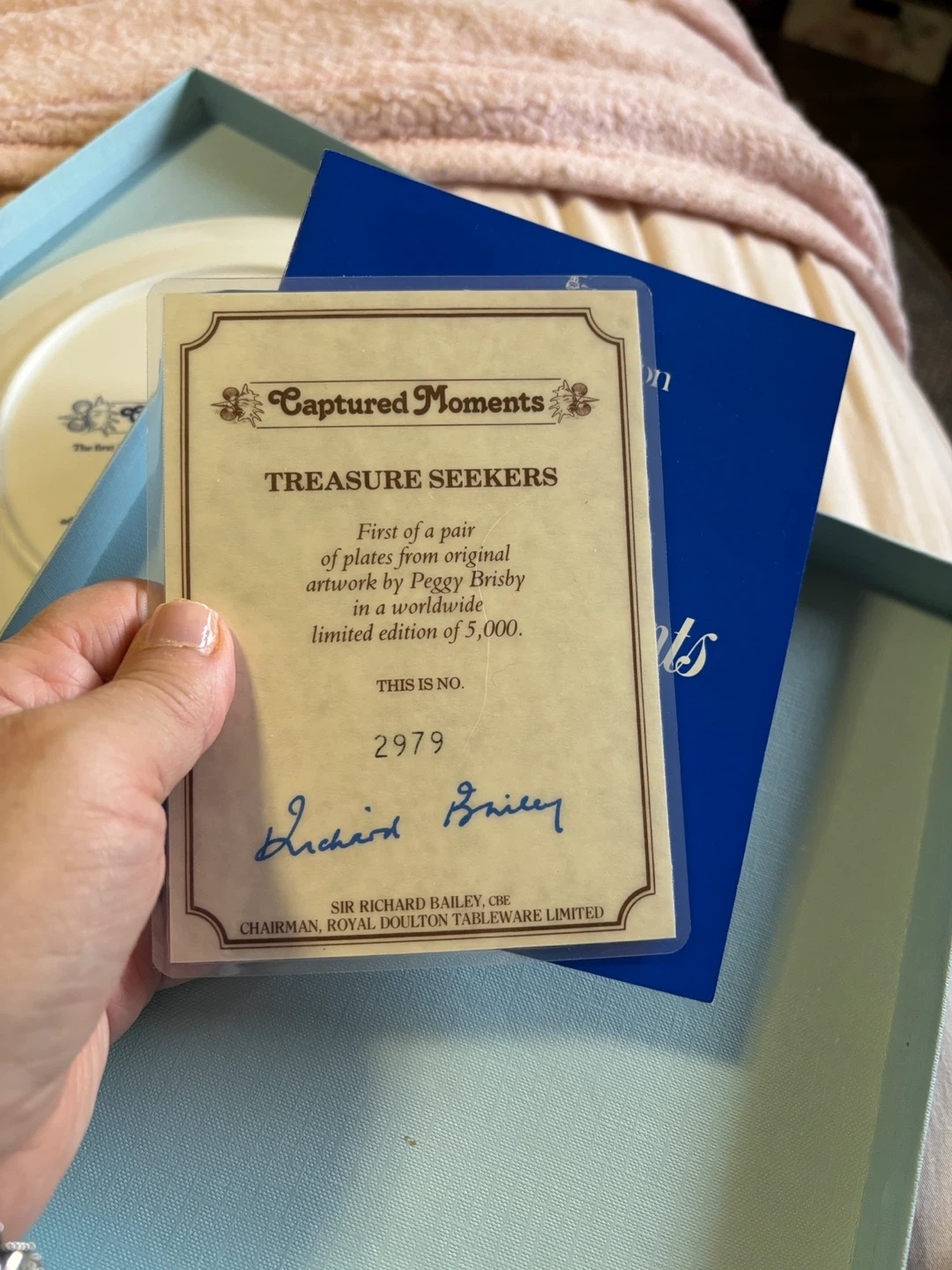 This is the Royal Doulton "Captured Moments" "Treasure Seekers" collector plate, the first in a pair of plates from original artwork by Peggy Brisby. It's a limited edition of 5,000, and this particular plate is number 2979. It comes with its original box and documentation.