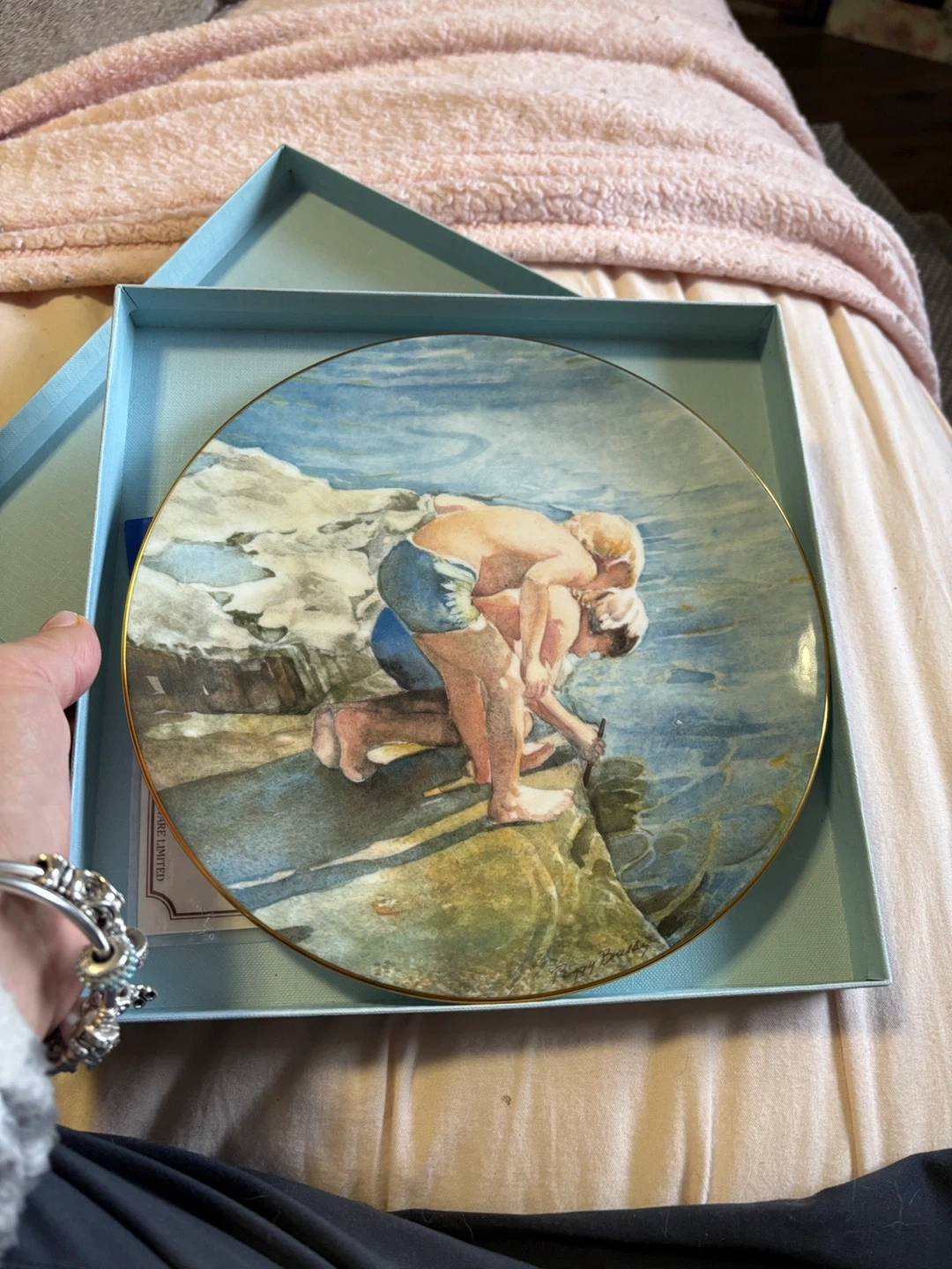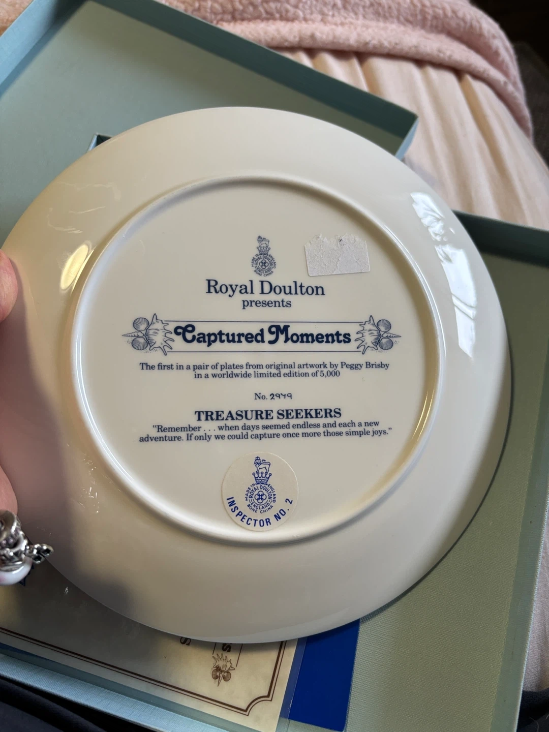 This is the Royal Doulton "Captured Moments" "Treasure Seekers" collector plate, the first in a pair of plates from original artwork by Peggy Brisby. It's a limited edition of 5,000, and this particular plate is number 2979. It comes with its original box and documentation.