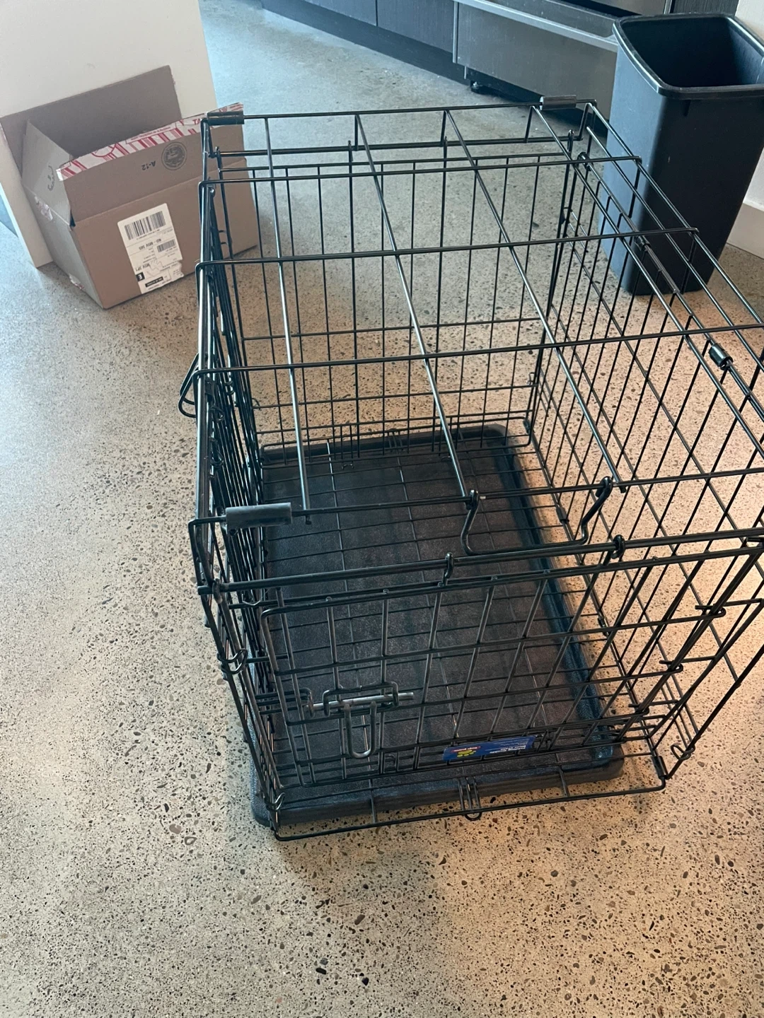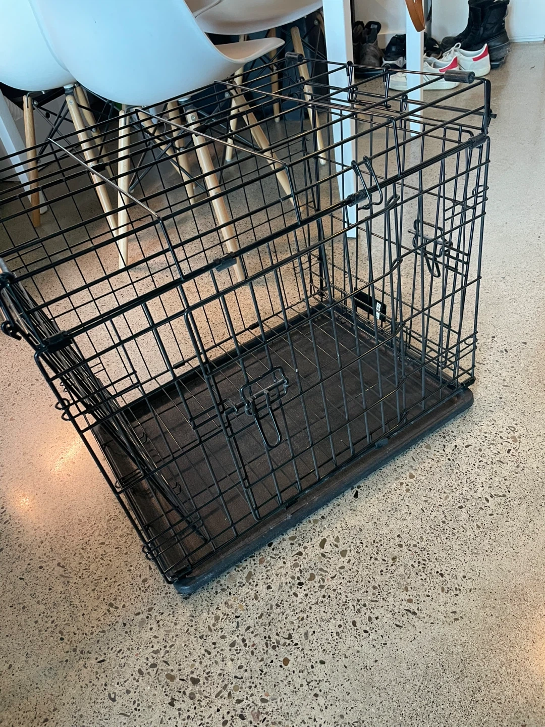 Wire dog crate with a black plastic tray. It's a sturdy enclosure for pets. This crate is suitable for training or travel.